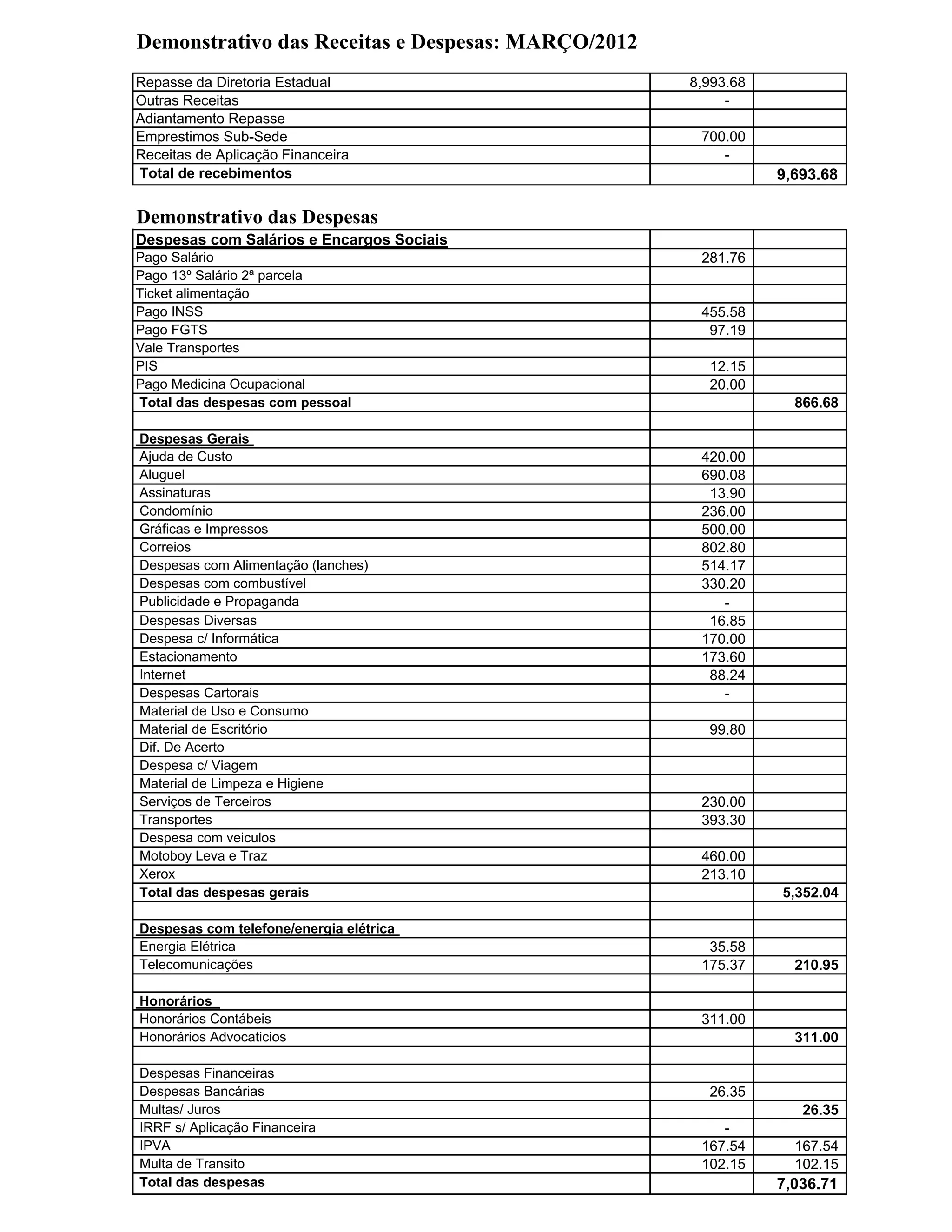 O documento apresenta o demonstrativo financeiro de março de 2012 de uma organização sindical. As receitas totais foram de R$9.693,68, provenientes principalmente de repasses da diretoria estadual. As despesas somaram R$7.036,71, incluindo gastos com pessoal, gerais, telefone/energia, honorários e financeiras. O saldo final em 31/03 foi de R$11.488,34.