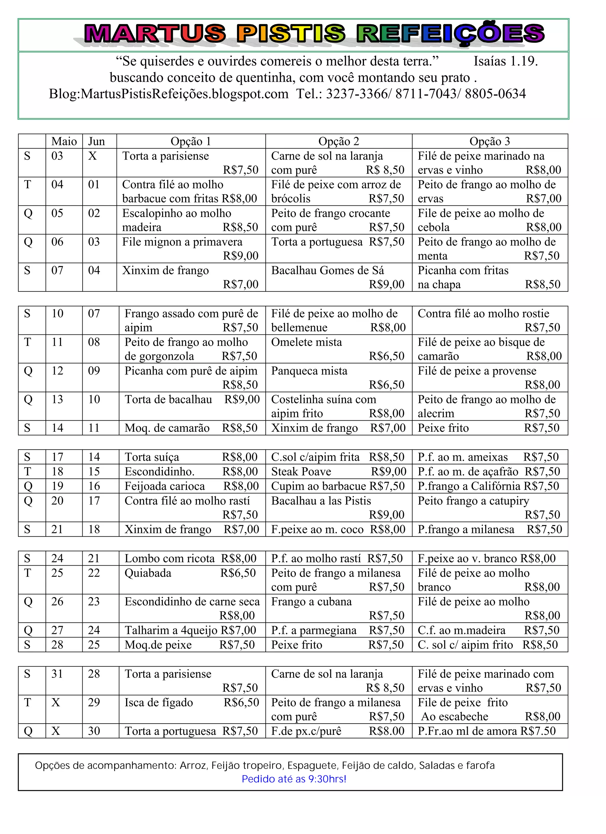 Este documento apresenta o cardápio de uma quentinha para os meses de maio e junho, oferecendo 3 opções de pratos principais por dia por preços entre R$6,50 e R$9,00. As opções incluem carnes, peixes e frangos acompanhados por arroz, feijão ou saladas. Os pedidos devem ser feitos até às 9h30.