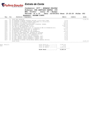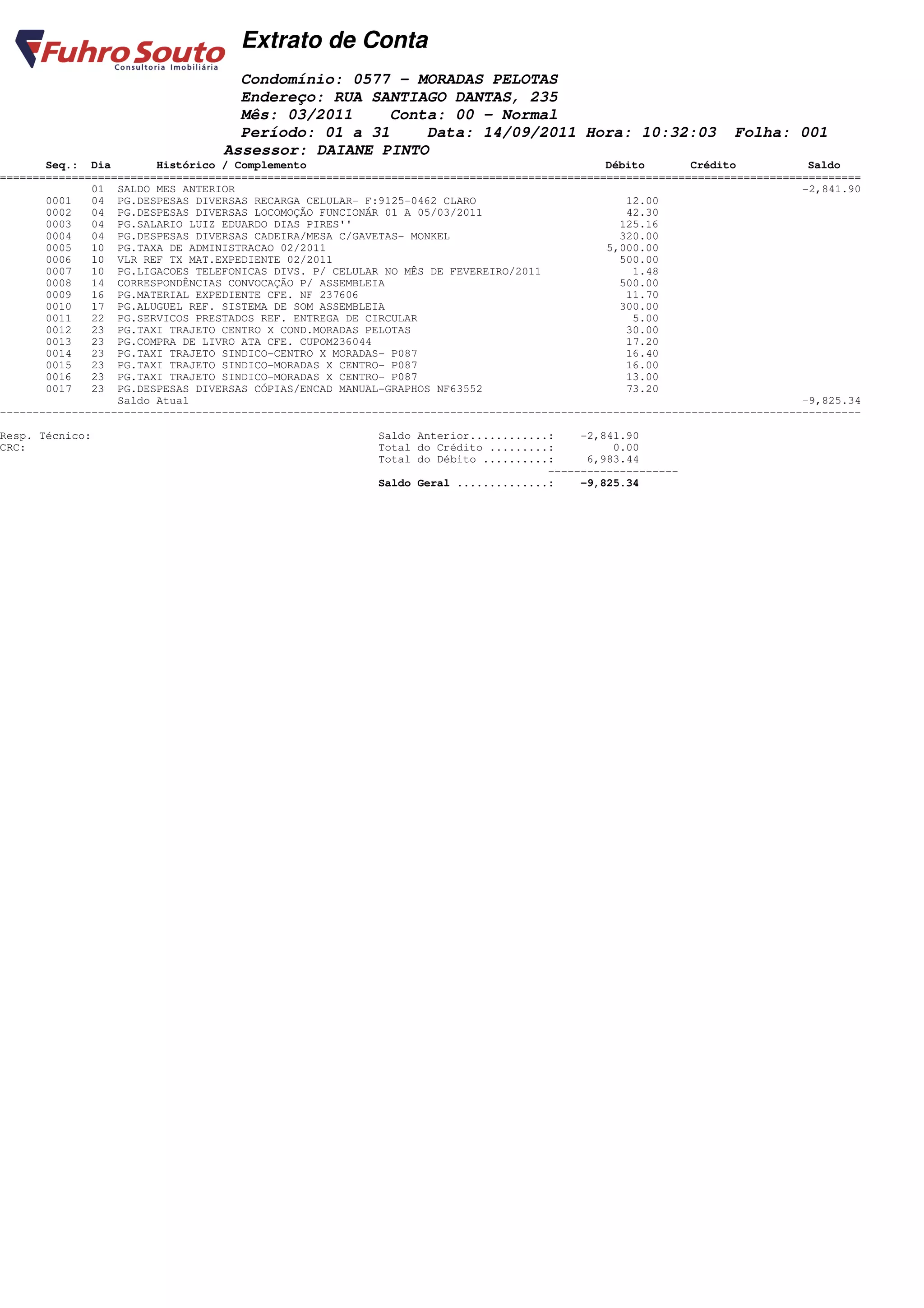 O extrato de conta do condomínio apresenta o saldo anterior negativo de R$2.841,90 e vários débitos no mês, totalizando R$6.983,44. Isso resultou em um saldo final ainda mais negativo de R$9.825,34.