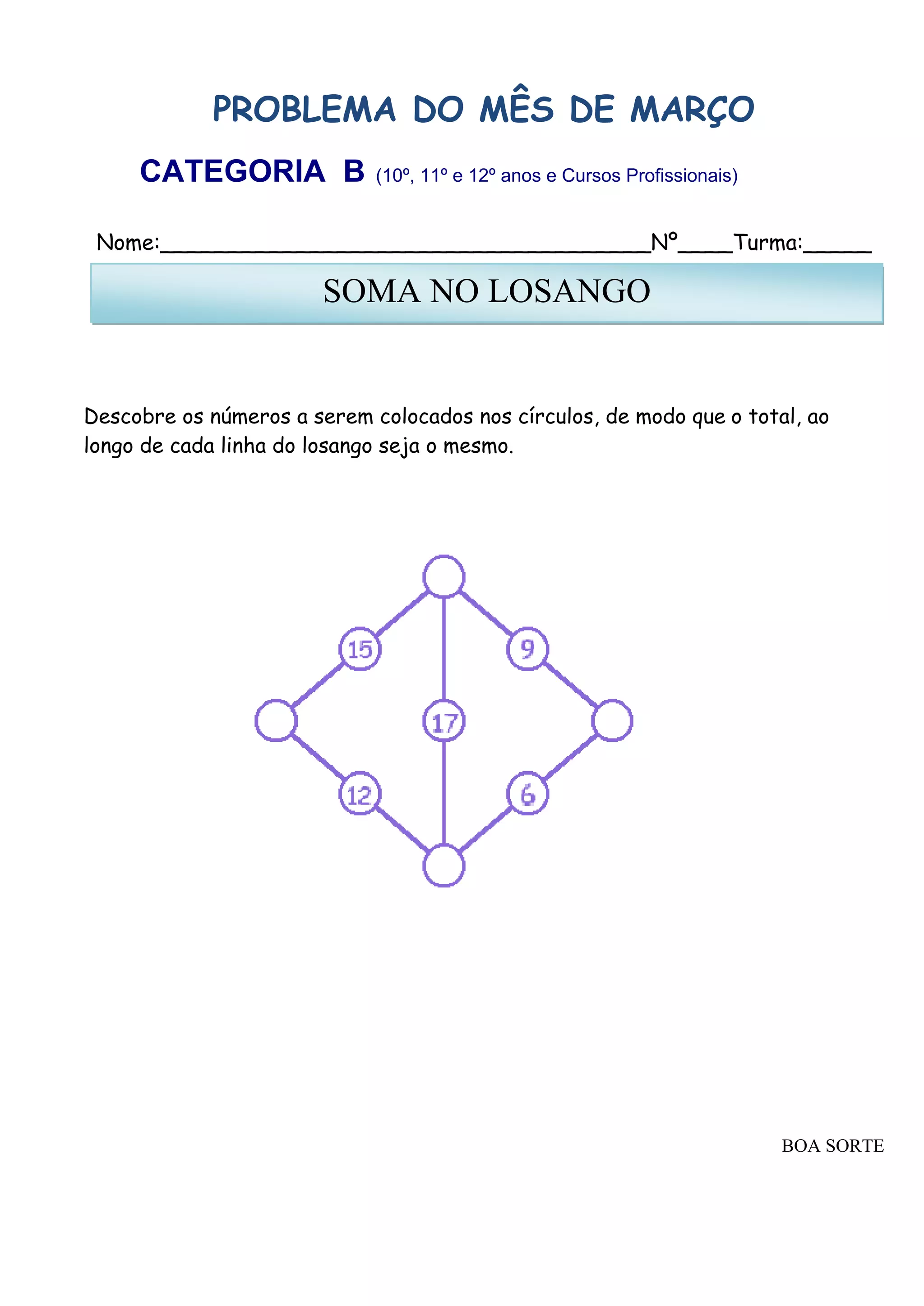 Este problema matemático pede aos alunos do 10o ao 12o ano e cursos profissionais que descubram os números a serem colocados nos círculos de um losango de modo que a soma ao longo de cada linha seja a mesma, testando sua habilidade com problemas de soma.