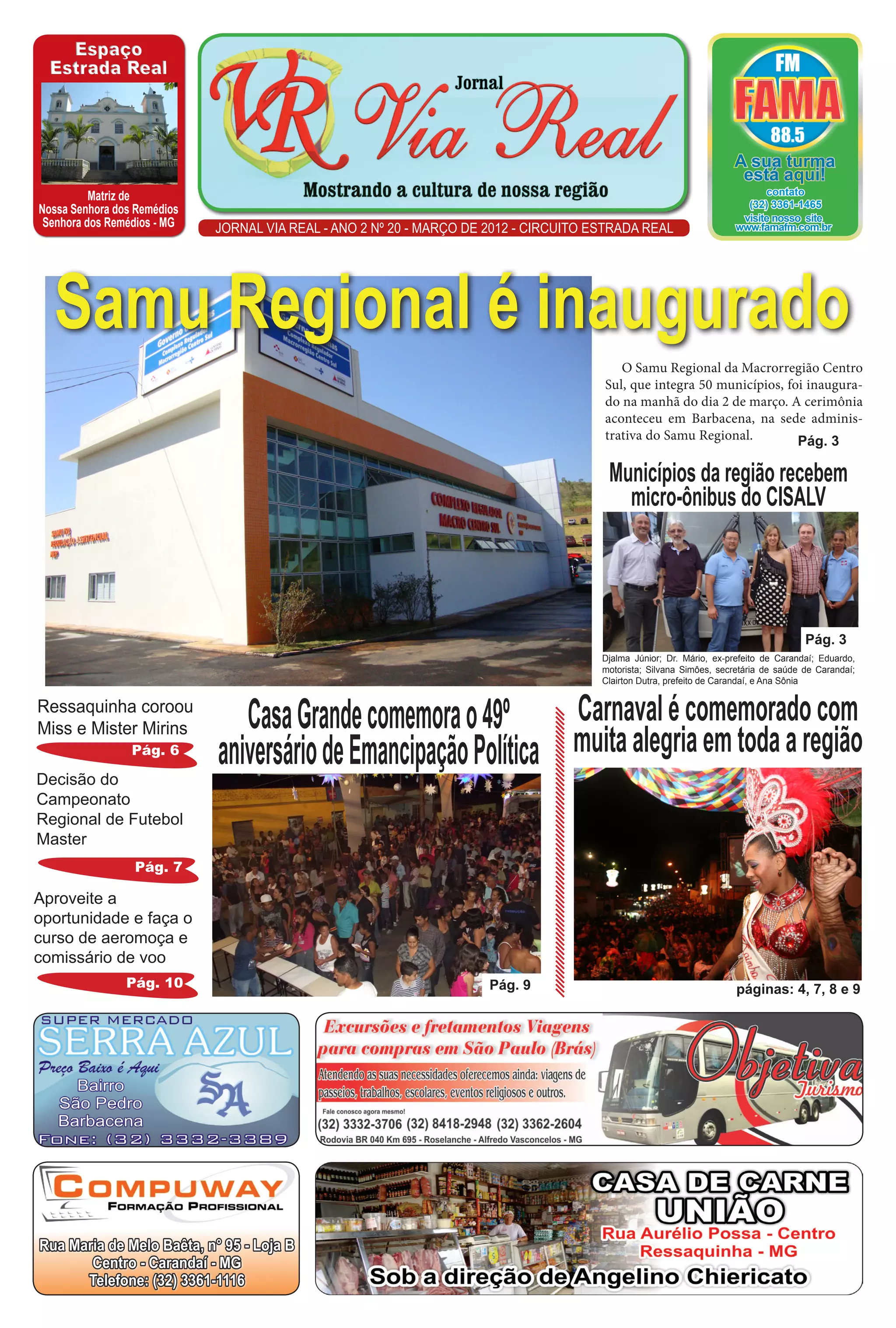 (1) O Samu Regional da Macrorregião Centro Sul, que integra 50 municípios, foi inaugurado em Barbacena. (2) Municípios da região receberam micro-ônibus do CISALV. (3) A Câmara Municipal de Ressaquinha informa que o Projeto de Lei enviado não mencionava micro-ônibus, apenas aumentava a participação do CISALV no município.