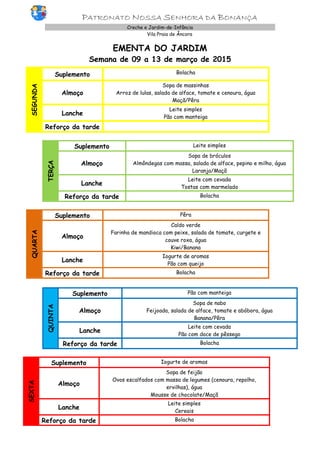 Este documento fornece as ementas semanais do jardim-de-infância "Patronato Nossa Senhora da Bonança" em Vila Praia de Âncora, incluindo sopas, pratos principais, sobremesas e lanches para as crianças. As refeições variam diariamente e incluem peixe, carne, legumes e fruta para fornecer uma alimentação balanceada durante a semana.
