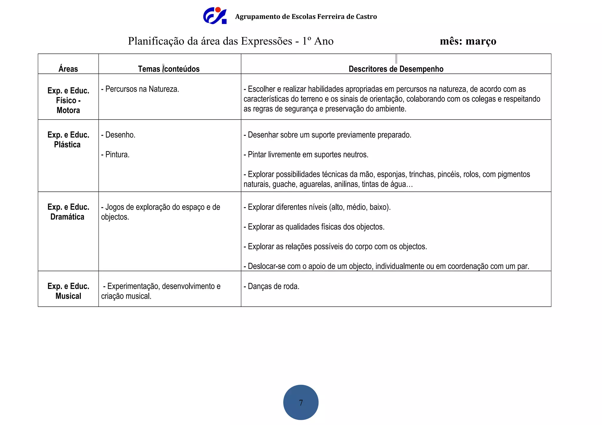 Este documento apresenta as planificações das áreas curriculares para o 1o ano de escolaridade no mês de março. Inclui planificações para Expressões, Português, Estudo do Meio e Matemática, com os temas/conteúdos e descritores de desempenho a desenvolver em cada área.