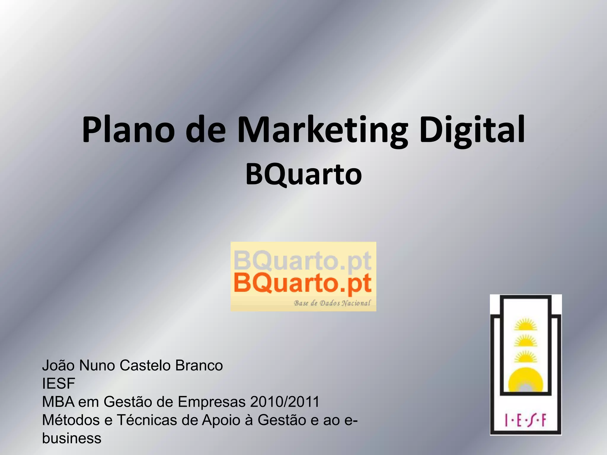 O documento apresenta um plano de marketing digital para o site BQuarto, que permite o arrendamento de quartos entre particulares. O plano propõe o uso de ferramentas como marketing viral, SEO, verificadores online e publicidade contextual para aumentar as visitas ao site e gerar receitas, de modo a tornar o modelo de negócio mais sustentável.