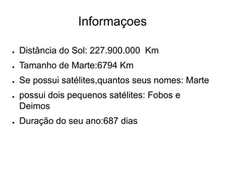 Marte é o quarto planeta do sistema solar e está mais próximo da Terra do que do Sol. Possui dois pequenos satélites naturais chamados Fobos e Deimos, além de uma superfície vermelha semelhante à Terra com água em seu subsolo. Uma rocha encontrada em Marte lembra o Pão de Açúcar no Rio de Janeiro.