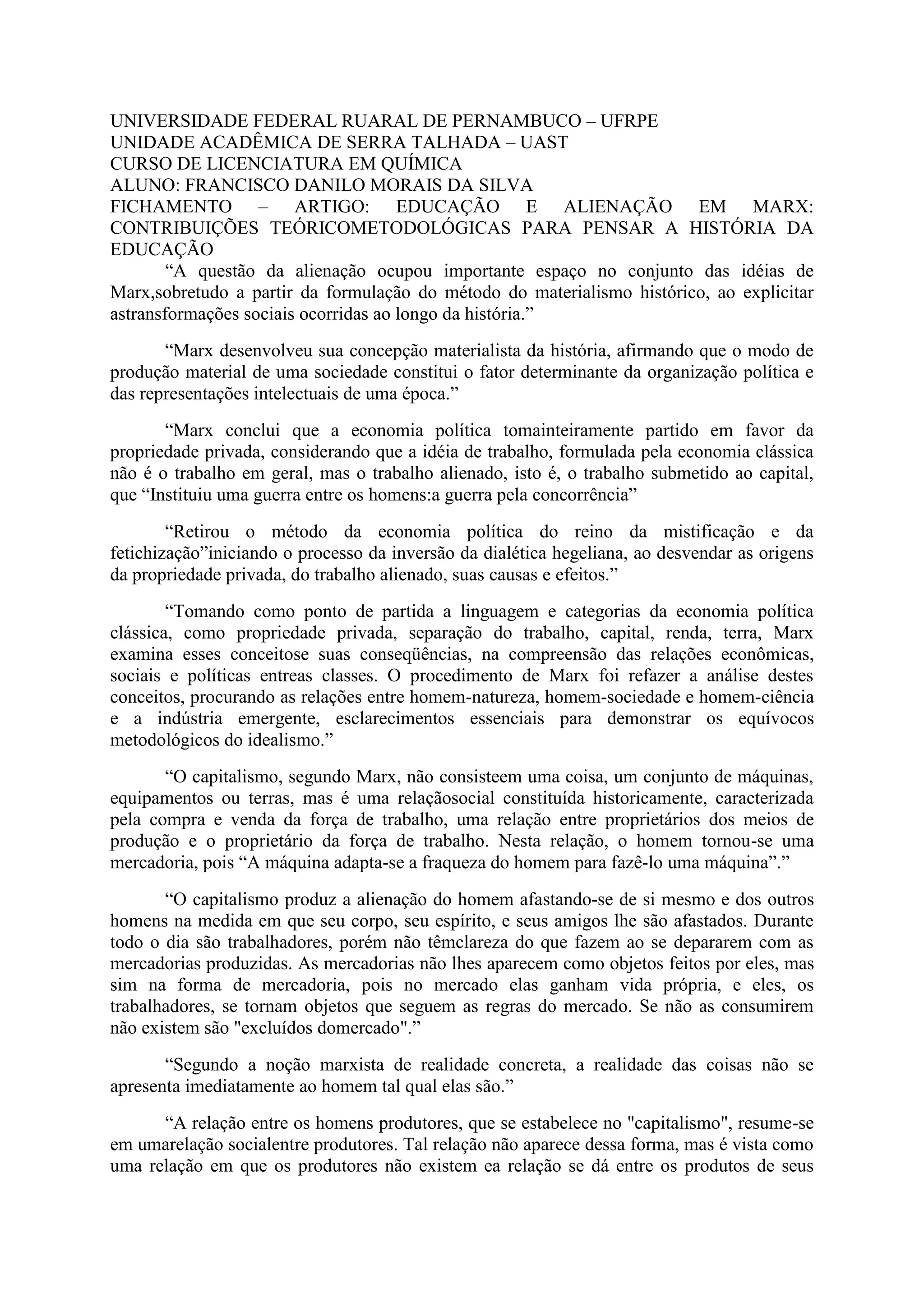 O documento discute os conceitos de alienação e educação em Marx. Afirma que Marx via o modo de produção como fator determinante da organização social e das representações intelectuais de uma época. Segundo Marx, no capitalismo os trabalhadores são alienados dos produtos de seu trabalho e se tornam objetos das regras do mercado. A educação burguesa também promove a alienação ao fragmentar as atividades humanas.