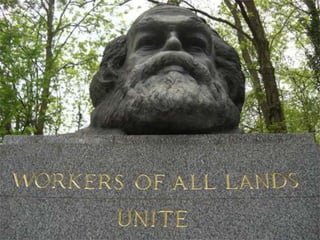 O documento apresenta as visões de Hegel e Marx sobre história e revolução. Hegel via a história como tendo um fim com o estabelecimento do estado, enquanto Marx rejeitava que o estado fosse a razão e via a infraestrutura econômica determinando a superestrutura social, levando à necessidade de revolução proletária.