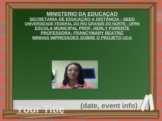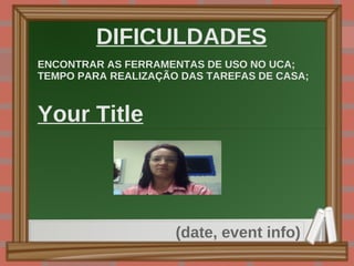 Uma professora relata suas impressões sobre um projeto educacional chamado UCA Your Title. Ela encontrou dificuldades em achar as ferramentas certas no computador e tempo para completar as tarefas. Com cada encontro, sua familiaridade com o computador e o programa aumentou, diminuindo as dificuldades. Ela sugere trocar o computador por um modelo maior.