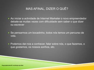 O documento discute como iniciantes em marketing digital podem encontrar assuntos para escrever sobre. Sugere focar em sua própria história de vida, interesses e paixões ou ensinar sobre tópicos que domina. Também recomenda identificar grupos com interesses semelhantes e abordar suas necessidades e desejos.