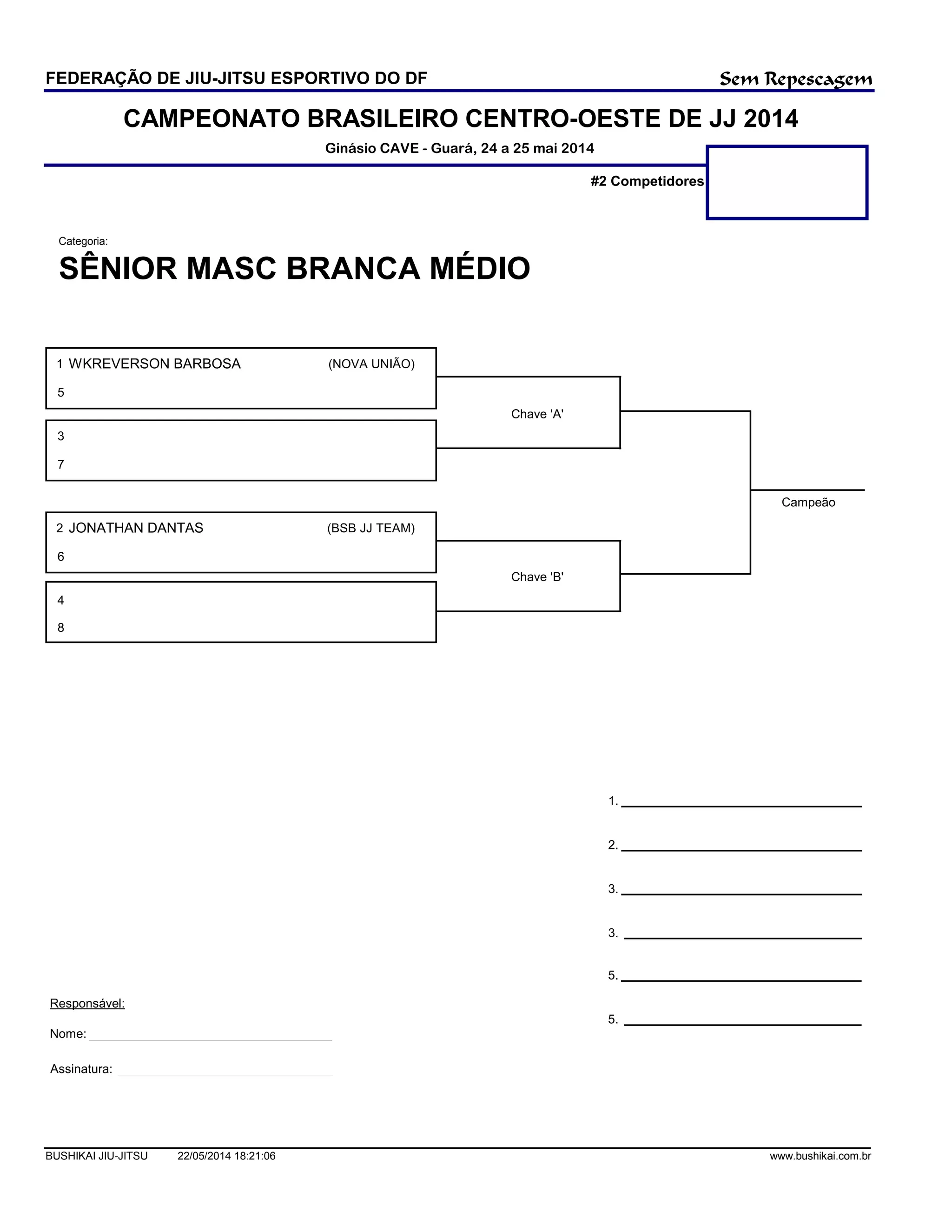 O documento descreve o campeonato brasileiro centro-oeste de jiu-jitsu de 2014, realizado em Guará nos dias 24 e 25 de maio. A categoria Sênior Masculino Branca Médio teve 2 competidores sem repescagem, sendo o campeão Wkreverson Barbosa da equipe Nova União e o segundo colocado Jonathan Dantas da equipe BSB JJ Team.