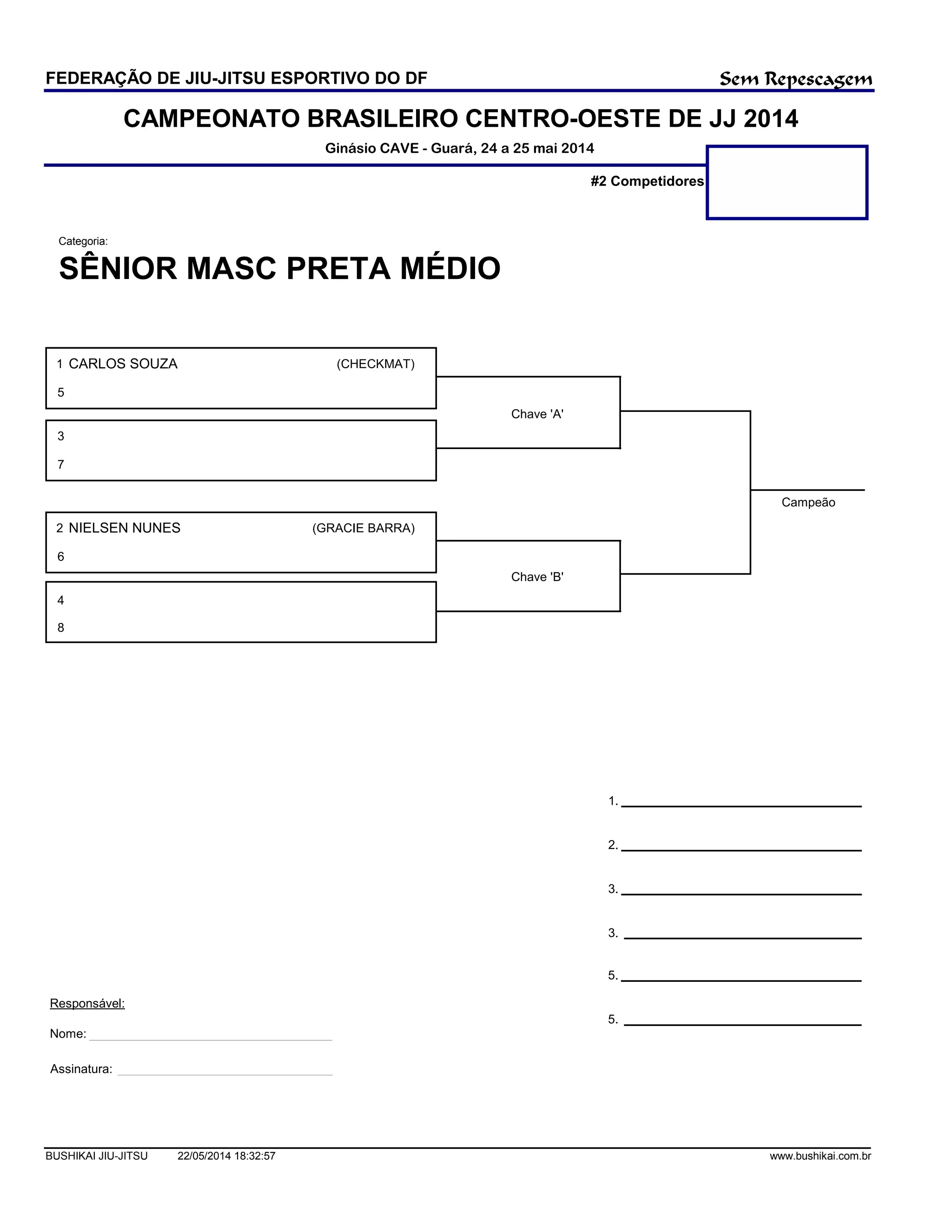 O documento descreve o campeonato brasileiro centro-oeste de jiu-jitsu de 2014, realizado nos dias 24 e 25 de maio no ginásio CAVE em Guará. A categoria sênior masculino preta médio teve 2 competidores sem repescagem, com Carlos Souza da equipe Checkmat sendo o campeão.