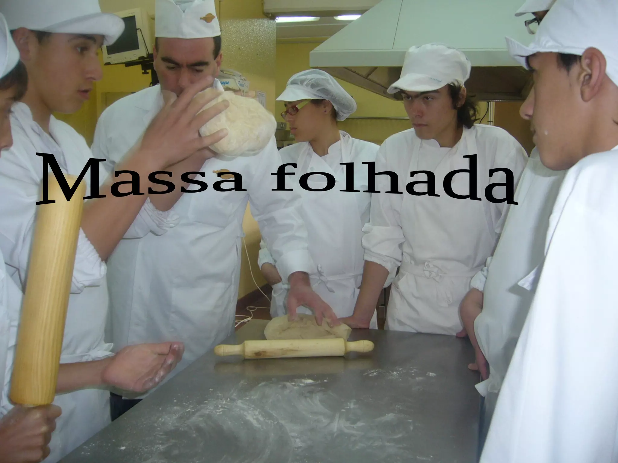 Receita para massa folhada que inclui amassar 1 kg de farinha com sal, esticar a massa em 3 cm de espessura, colocar 400 g de manteiga no meio e dobrar a massa várias vezes para incorporar a manteiga. A massa repousa por 30 minutos antes de ser usada para rechear salsichas ou fiambre e queijo e assar por 40 minutos.