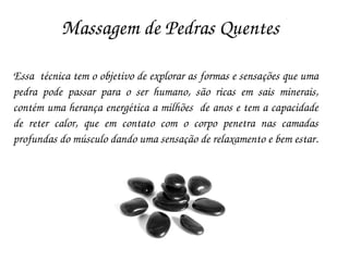 O documento descreve a técnica de massagem com pedras quentes, que utiliza pedras ricas em minerais para proporcionar relaxamento e bem-estar, influenciando a circulação sanguínea e promovendo desintoxicação. A prática combina elementos da massagem sueca, shiatsu e termoterapia, indicando também cuidados específicos com os cristais utilizados e contraindicações. Além disso, enfatiza a importância do conforto do cliente durante a massagem.