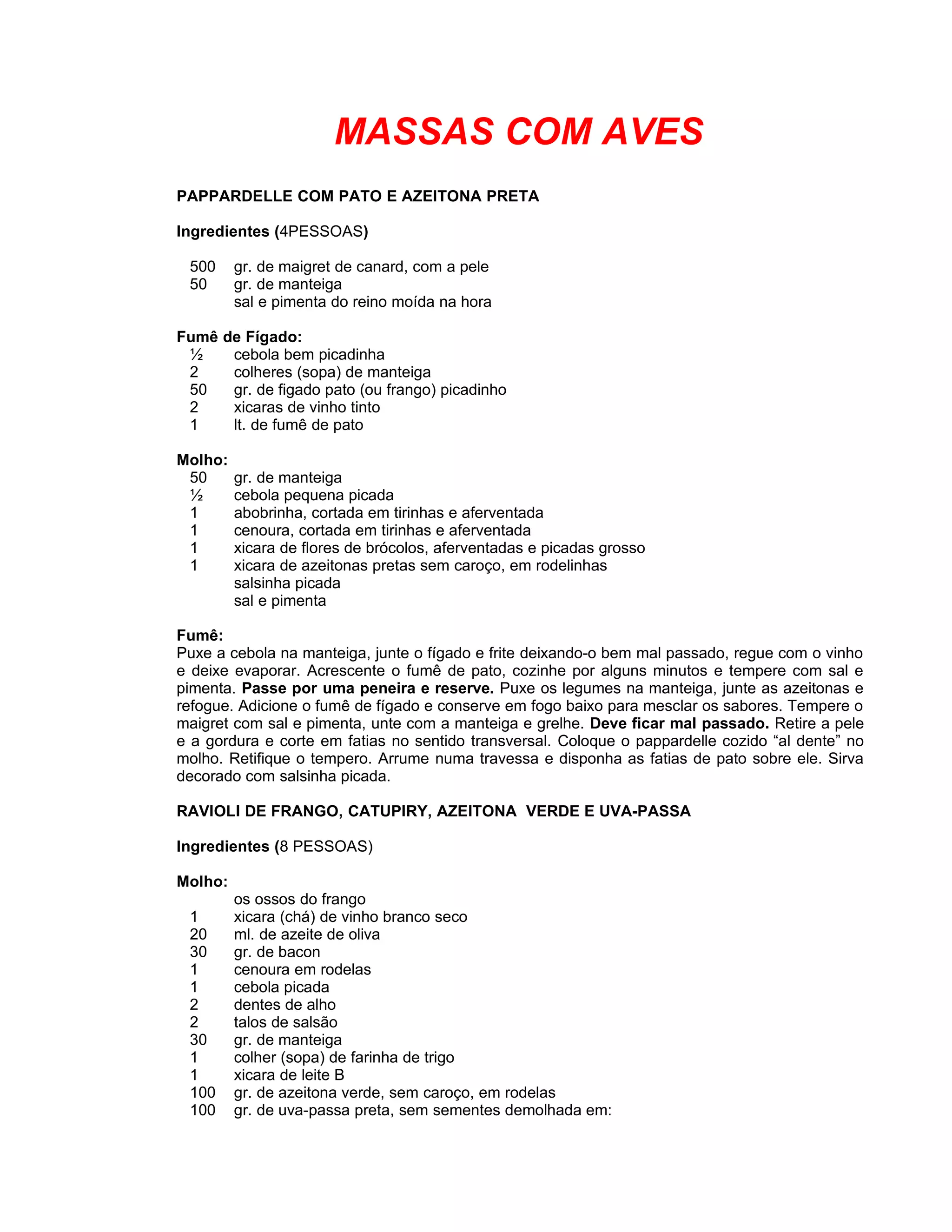 O documento fornece receitas para massas recheadas e molhos para acompanhar. A primeira receita é para pappardelle com pato e azeitona preta. A segunda é para ravioli de frango, catupiry, azeitona verde e uva-passa. A terceira é para ravioli de perdiz com champignon.