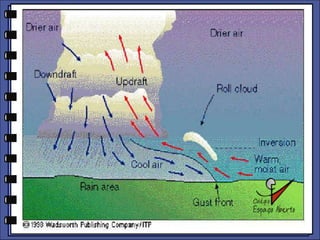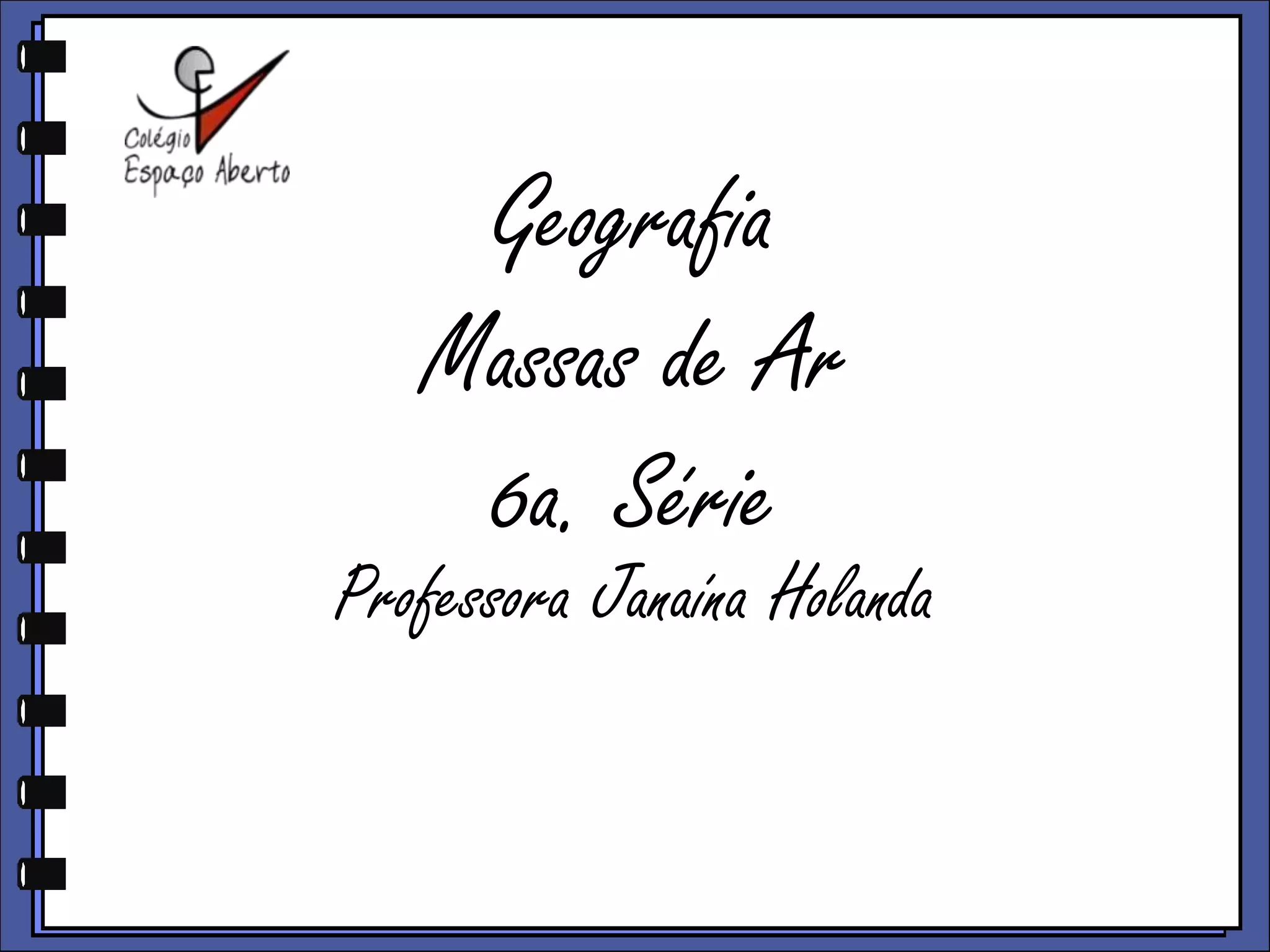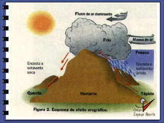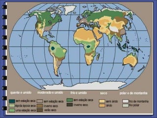 O documento discute as massas de ar, incluindo suas propriedades e tipos. Ele explica que as massas de ar mais importantes para o território brasileiro são a massa equatorial atlântica, a massa equatorial continental, a massa tropical atlântica e a massa polar atlântica. O documento também fornece curiosidades sobre as regiões mais chuvosas e secas do mundo e as temperaturas extremas registradas em diferentes locais.