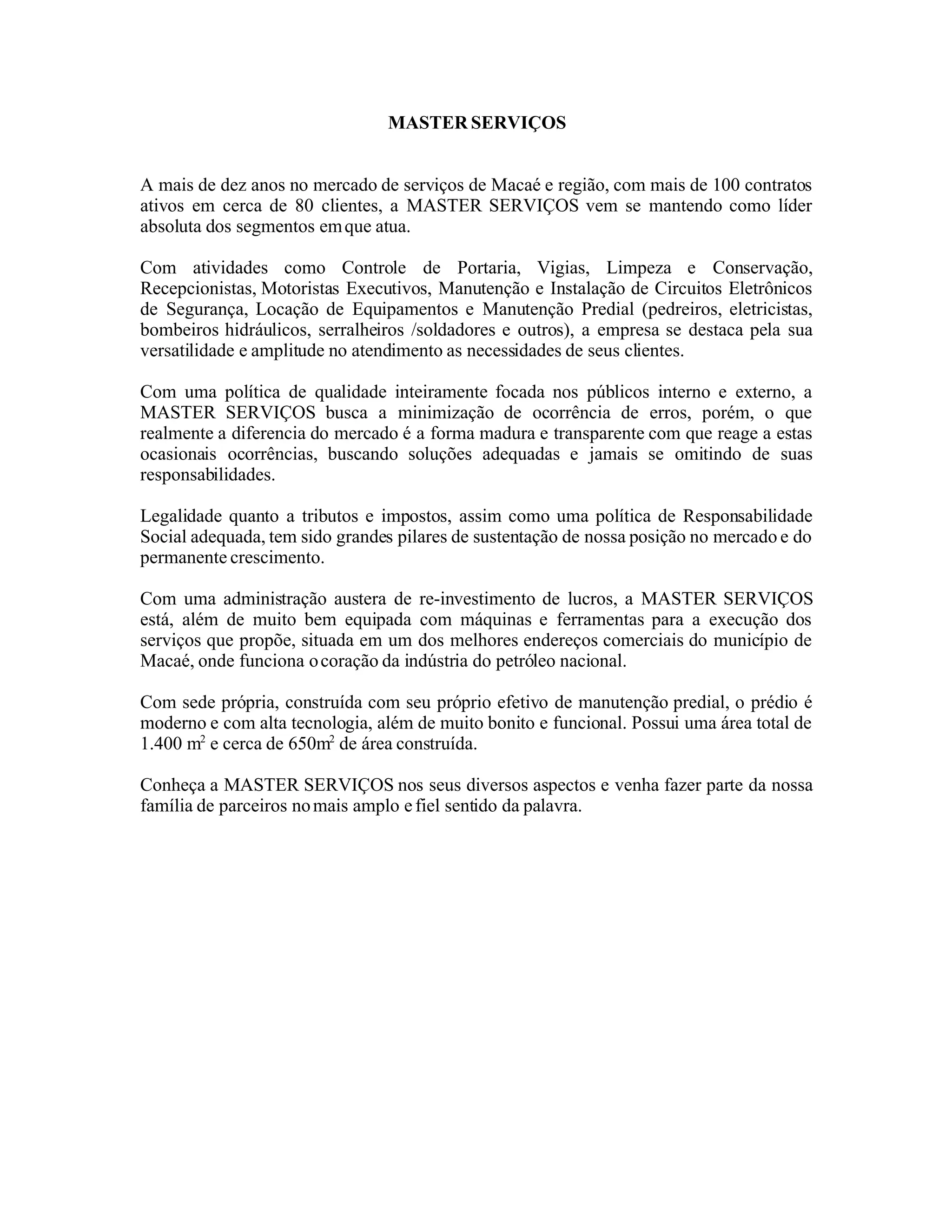 A MASTER SERVIÇOS é uma empresa de serviços líder no mercado de Macaé e região há mais de 10 anos, oferecendo serviços como segurança, limpeza, recepção, motoristas e manutenção. A empresa se destaca pela qualidade dos serviços, responsabilidade social e legalidade tributária.