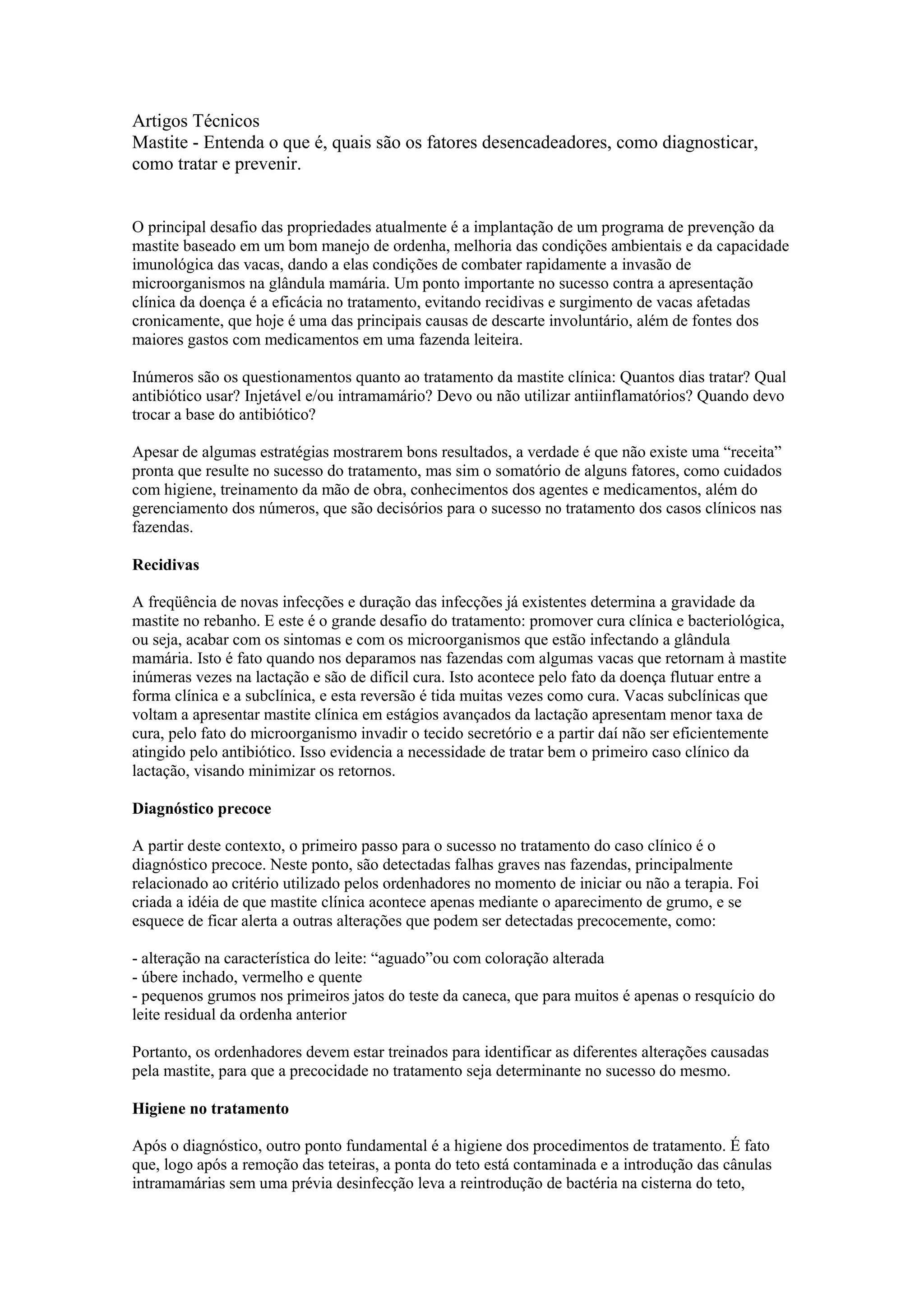 O documento discute estratégias para o diagnóstico e tratamento eficaz da mastite em vacas leiteiras, incluindo a importância do diagnóstico precoce, protocolos prolongados de tratamento com antibióticos intramamários, e fatores como higiene, imunidade e gestão de dados para escolha do tratamento.