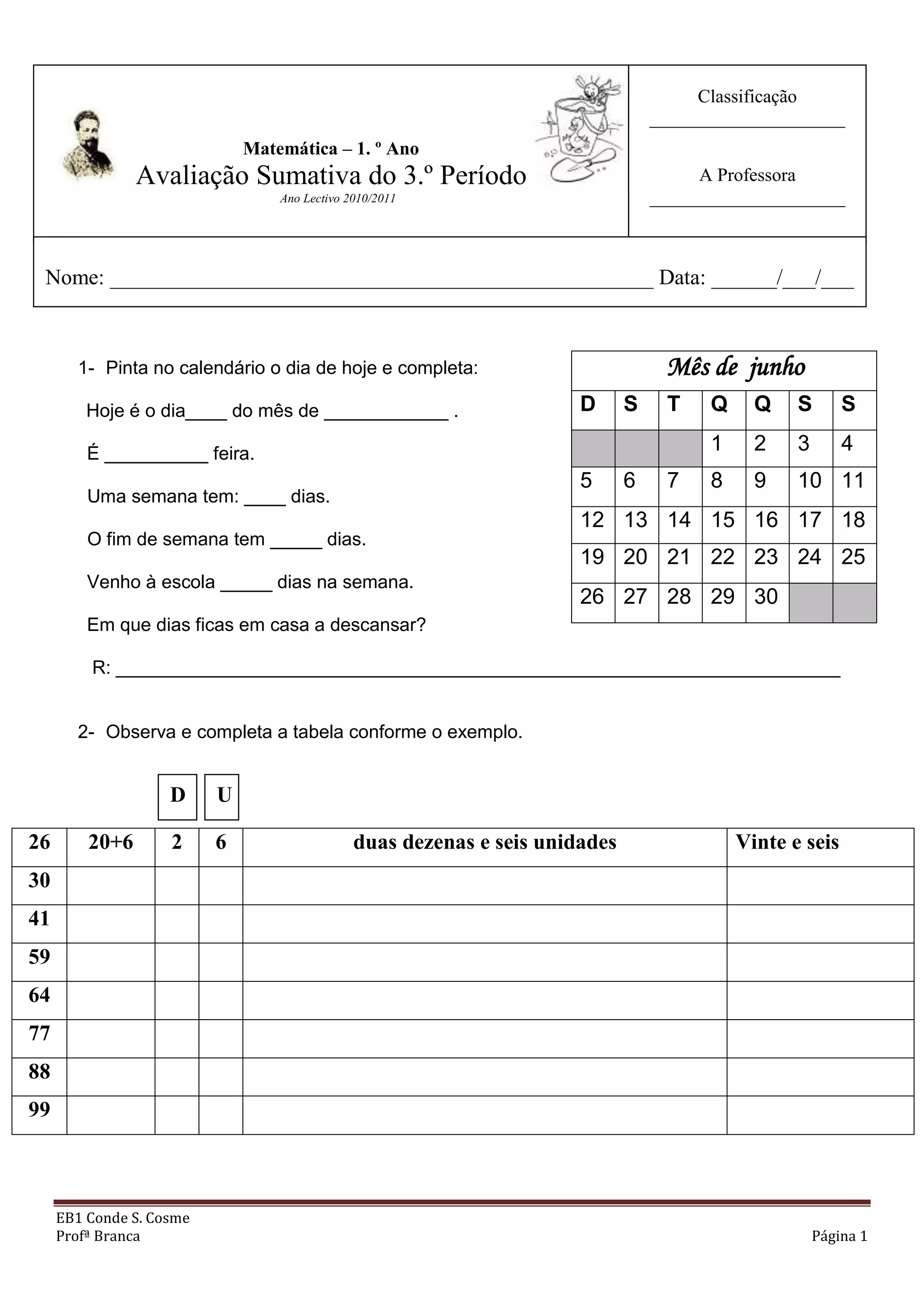 Este documento é uma avaliação de matemática do 3o período para alunos do 1o ano. Contém 14 questões que abrangem tópicos como datas, números, operações matemáticas, sequências, comparações e interpretação de gráficos. Os alunos devem completar as questões respondendo às instruções fornecidas.