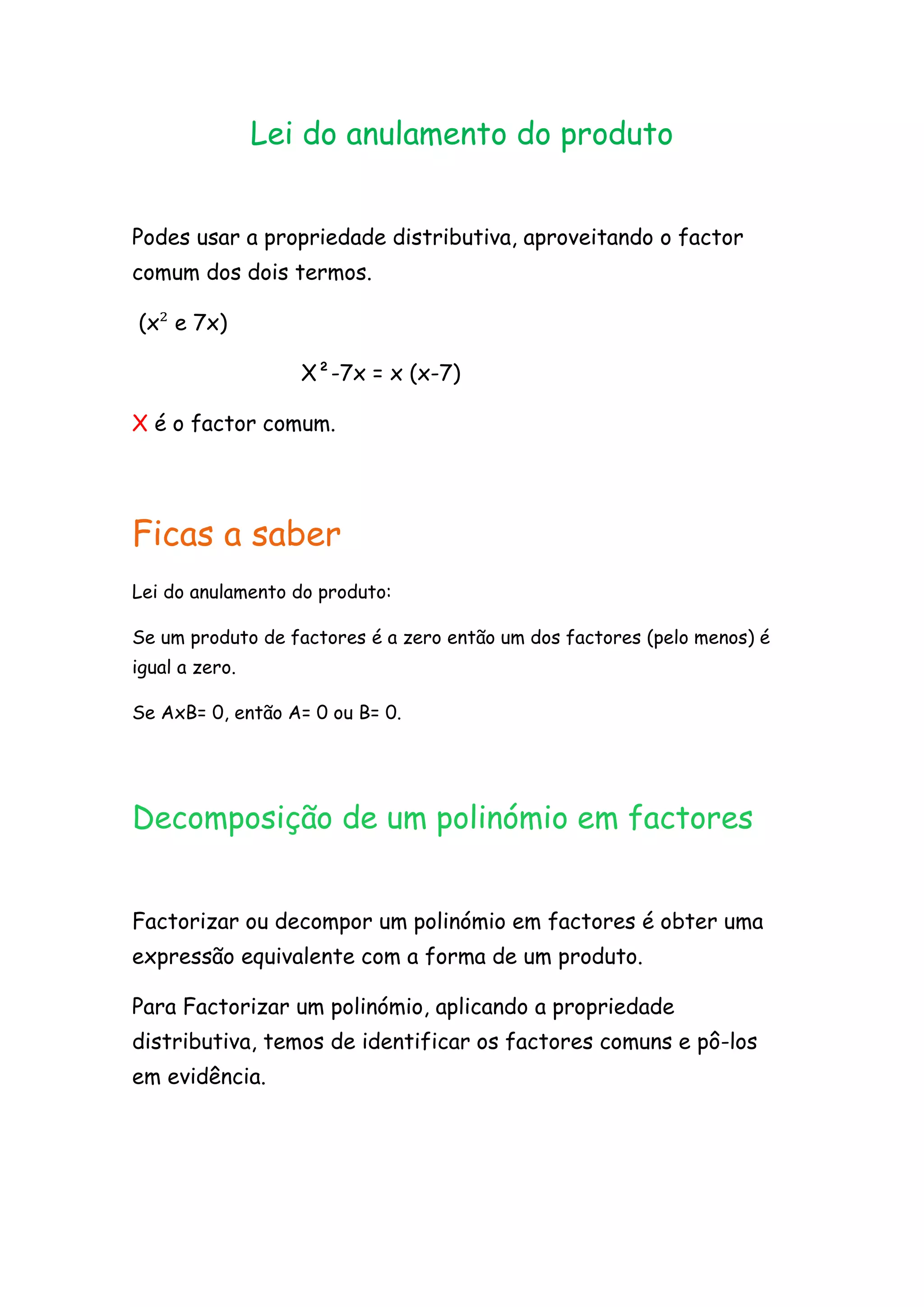 O documento descreve a lei do anulamento do produto, que estabelece que se um produto de fatores é igual a zero, então pelo menos um dos fatores deve ser igual a zero. Também explica como decompor um polinômio em fatores, identificando os fatores comuns e aplicando a propriedade distributiva para colocá-los em evidência.