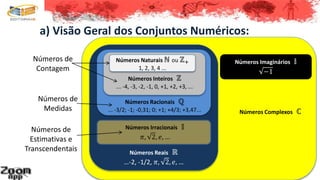 Este documento fornece uma visão geral dos diferentes tipos de números, incluindo números naturais, inteiros, racionais, irracionais e complexos. Ele discute as características e operações desses conjuntos numéricos, como números de contagem, medição e estimativas. Finalmente, fornece detalhes sobre números irracionais e suas operações.