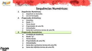 1. O documento discute sequências numéricas, com foco em progressões aritméticas e geométricas;
