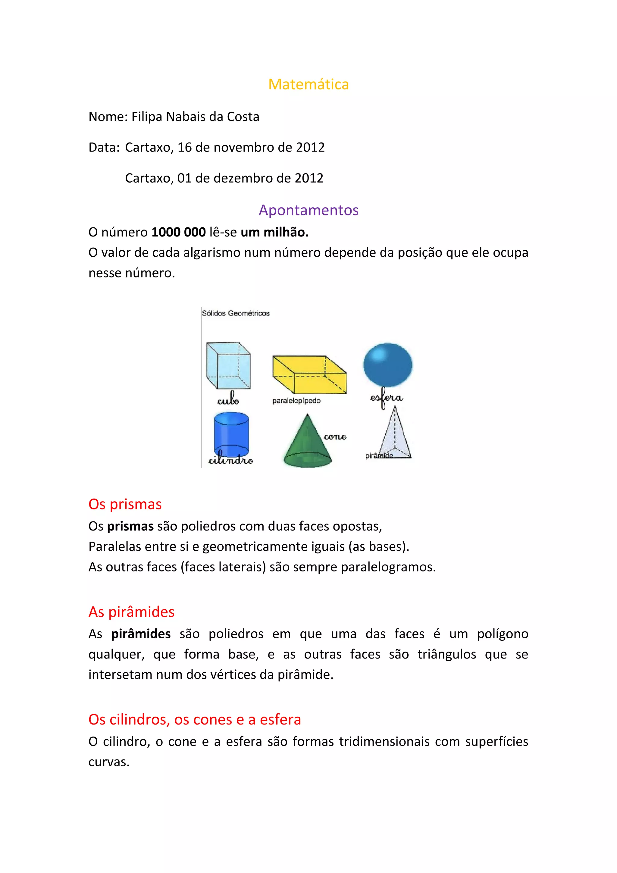 1) O documento discute conceitos matemáticos como números, posição de algarismos e formas geométricas tridimensionais.