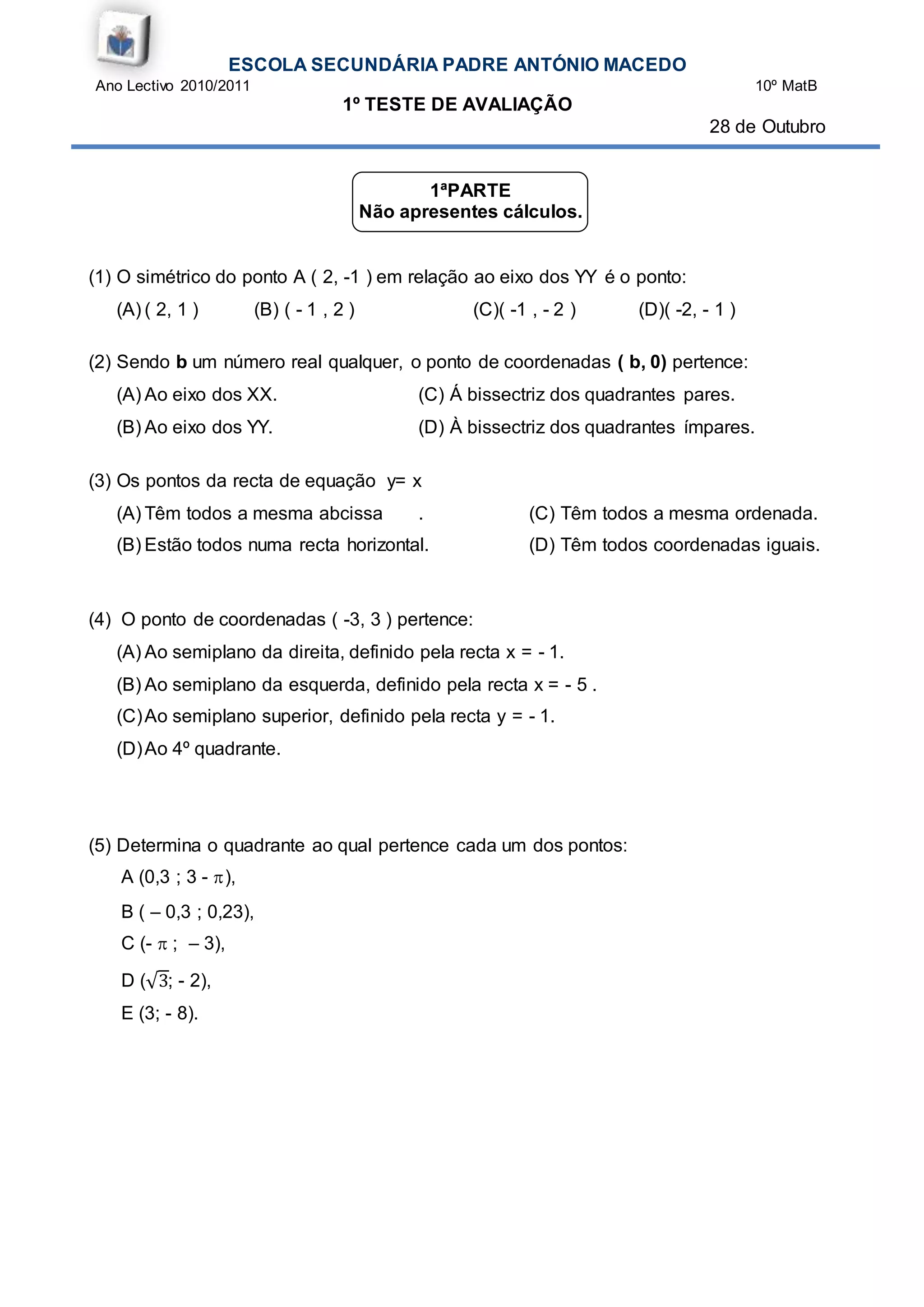 Este documento apresenta um teste de avaliação com 4 questões sobre geometria plana e espacial. A primeira questão pede para identificar símetras de pontos, pertença de pontos a eixos e rectas, e determinar quadrantes. A segunda questão solicita cálculos geométricos sobre áreas, comprimentos e possibilidade de encaixe de objetos em caixas. A terceira questão trata de ângulos internos de polígonos regulares e pavimentações. A quarta questão aborda identificação de arestas em cubos, âng