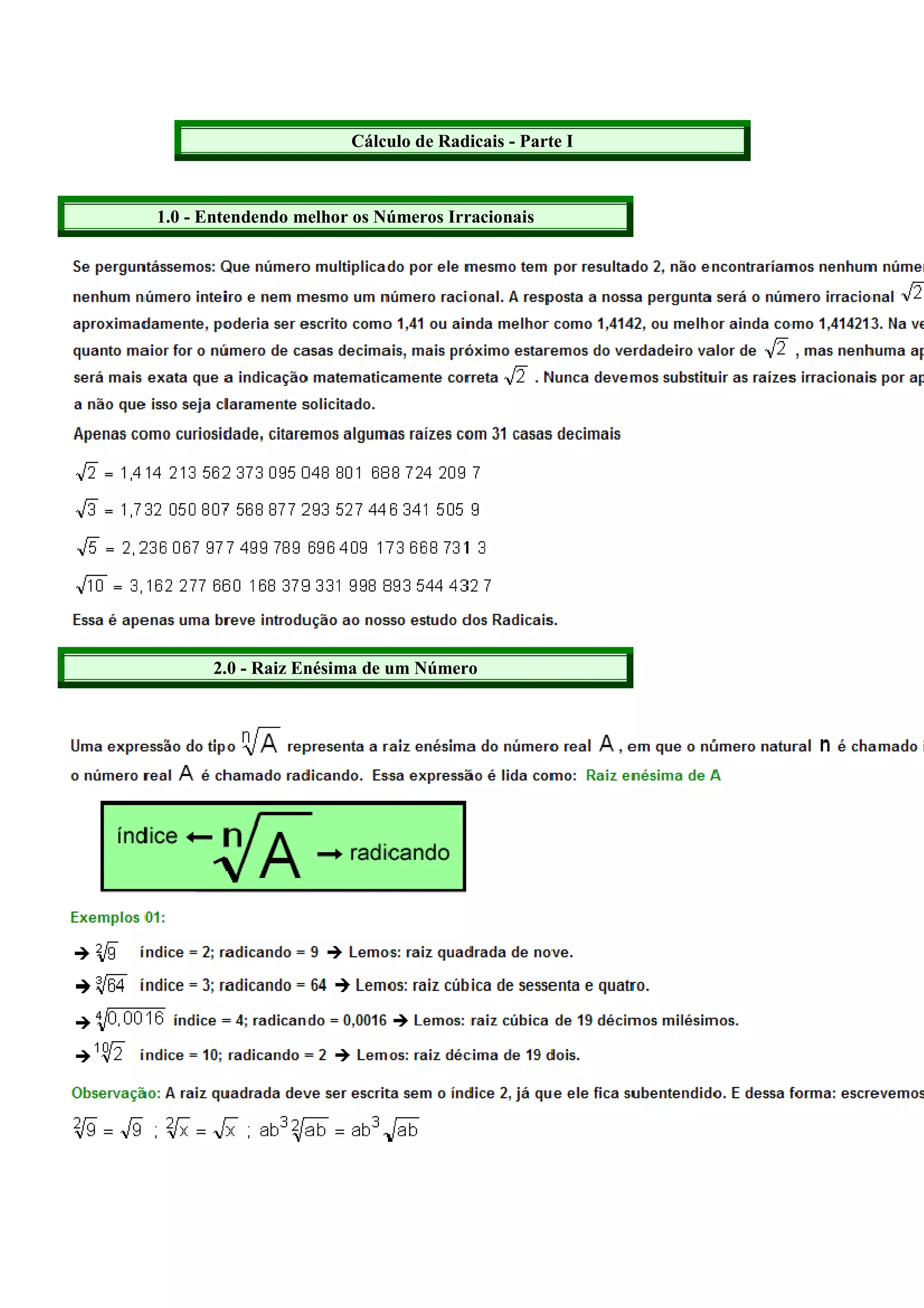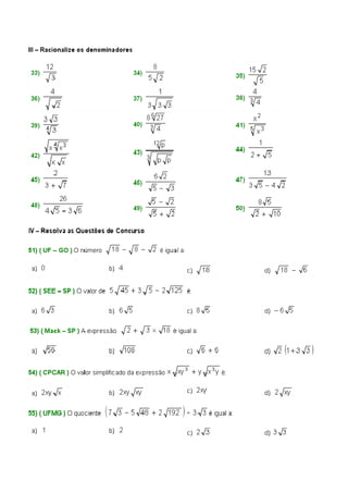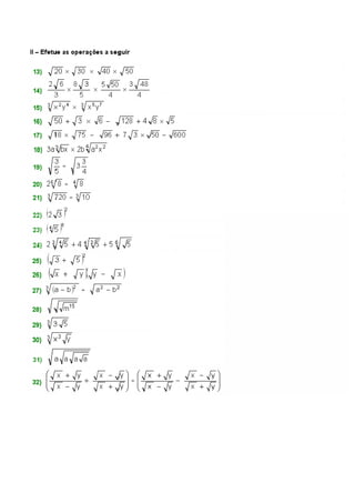 O documento discute cálculos e propriedades de radicais em 23 seções. Aborda conceitos como raiz enésima de um número, denominação e simplificação de radicais, operações entre radicais e racionalização de frações irracionais. Inclui também exercícios resolvidos e propostos com respostas.
