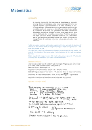 Este documento apresenta uma introdução sobre a segunda fase da prova de Matemática do vestibular da Unicamp, que avalia a capacidade de leitura, raciocínio abstrato e resolução de problemas dos candidatos. Ele contém quatro exemplos de questões com as respectivas respostas esperadas e comentários.