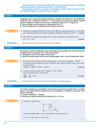 2) São apresentadas 5 questões de matemática com respostas, que abordam tópicos como temperatura, porcentagem, geometria e probabilidade.