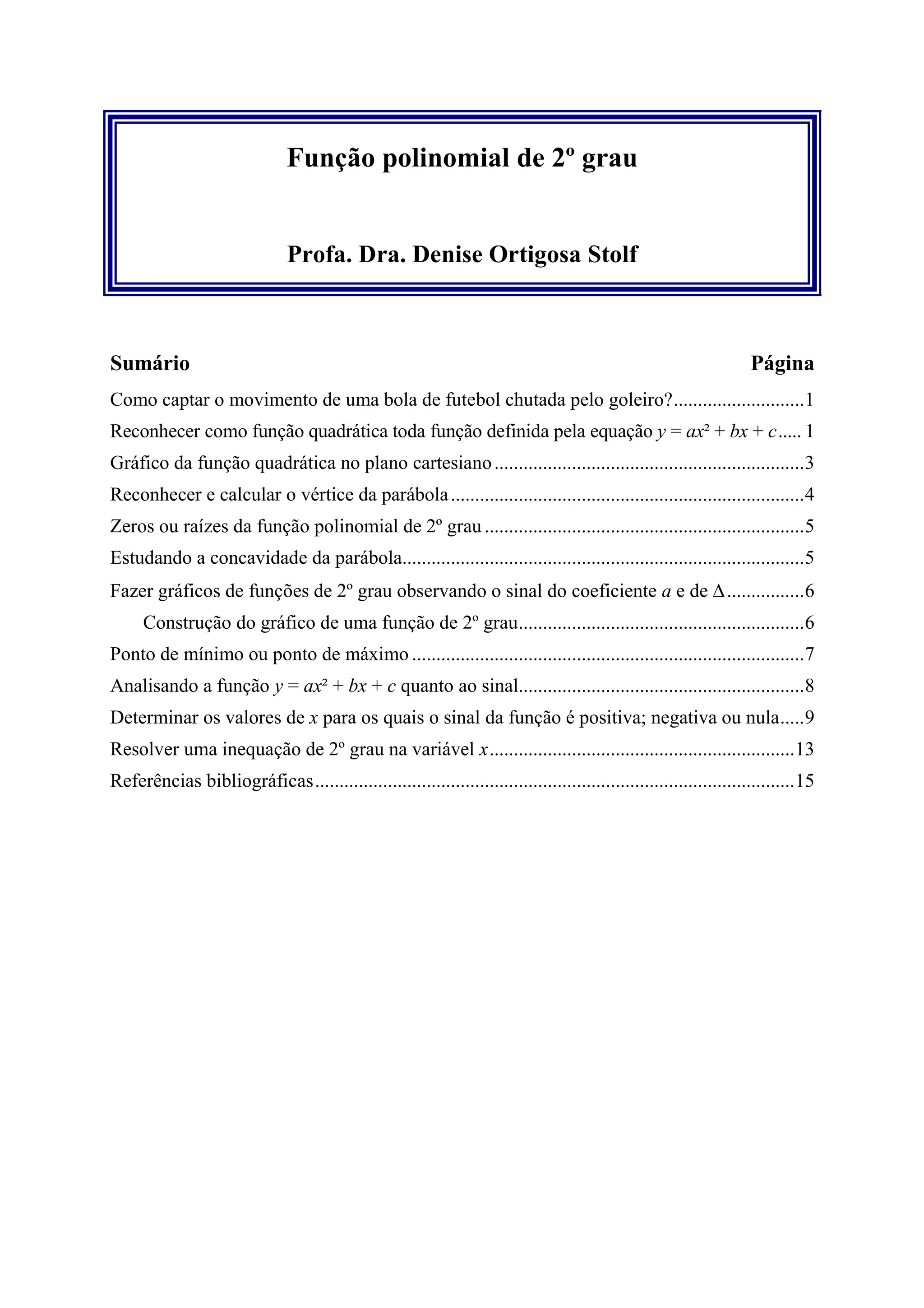 Este documento fornece uma introdução às funções polinomiais de 2o grau. Discute como Galileu Galilei usou funções quadráticas para descrever o movimento de objetos sob a gravidade. Também define funções quadráticas como qualquer função na forma y = ax2 + bx + c, e discute como calcular e interpretar os vértices, zeros, máximos e mínimos dessas funções.