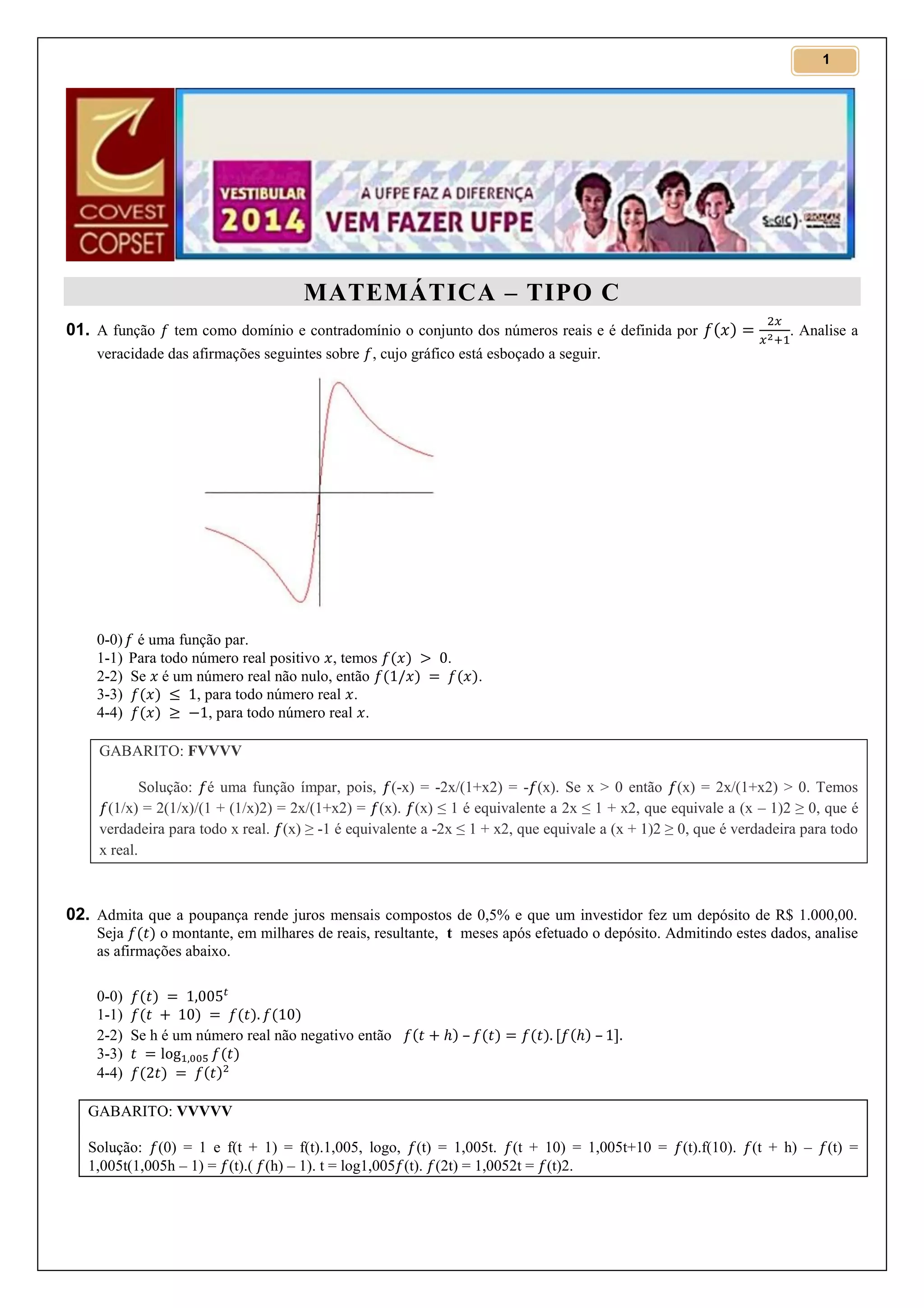 O documento apresenta 16 questões de matemática, com enunciados e gabaritos. As questões abordam tópicos como funções, juros compostos, geometria plana e espacial, probabilidade, proporcionalidade e porcentagem.