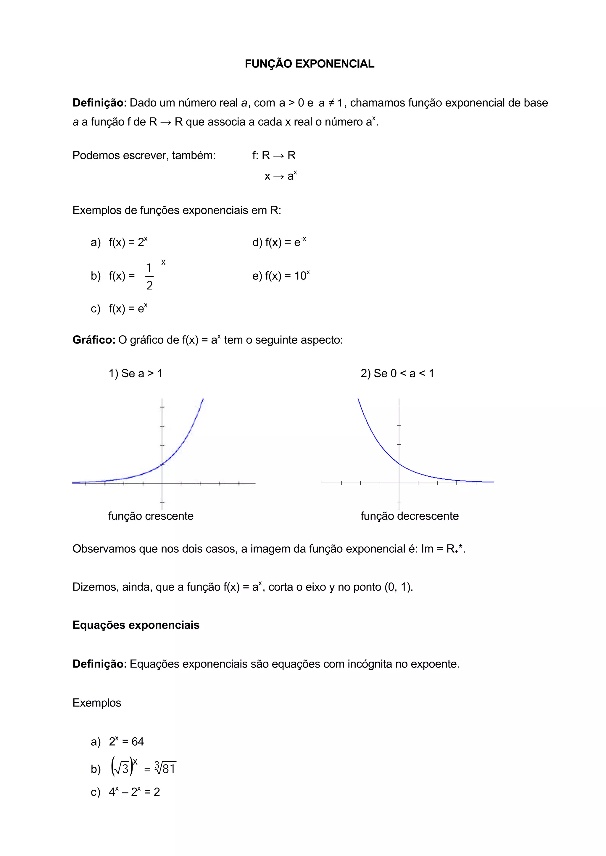 1) O documento apresenta os conceitos de função exponencial e logarítmica, incluindo suas definições, gráficos e propriedades.