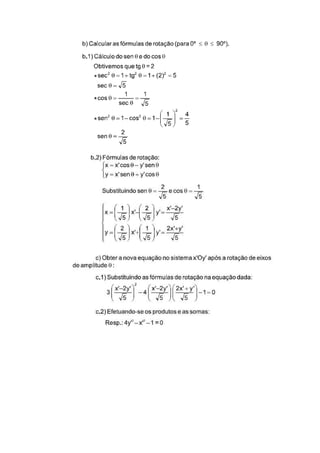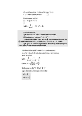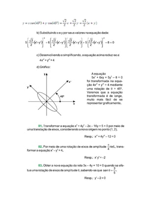 O documento discute estratégias matemáticas como translação e rotação de eixos para estudar cônicas em geometria analítica. Ele explica como usar essas técnicas para transformar equações de cônicas em sua forma padrão e esboçar seus gráficos, começando com uma rotação para eliminar termos de primeiro grau e depois uma translação para centralizar a cônica.
