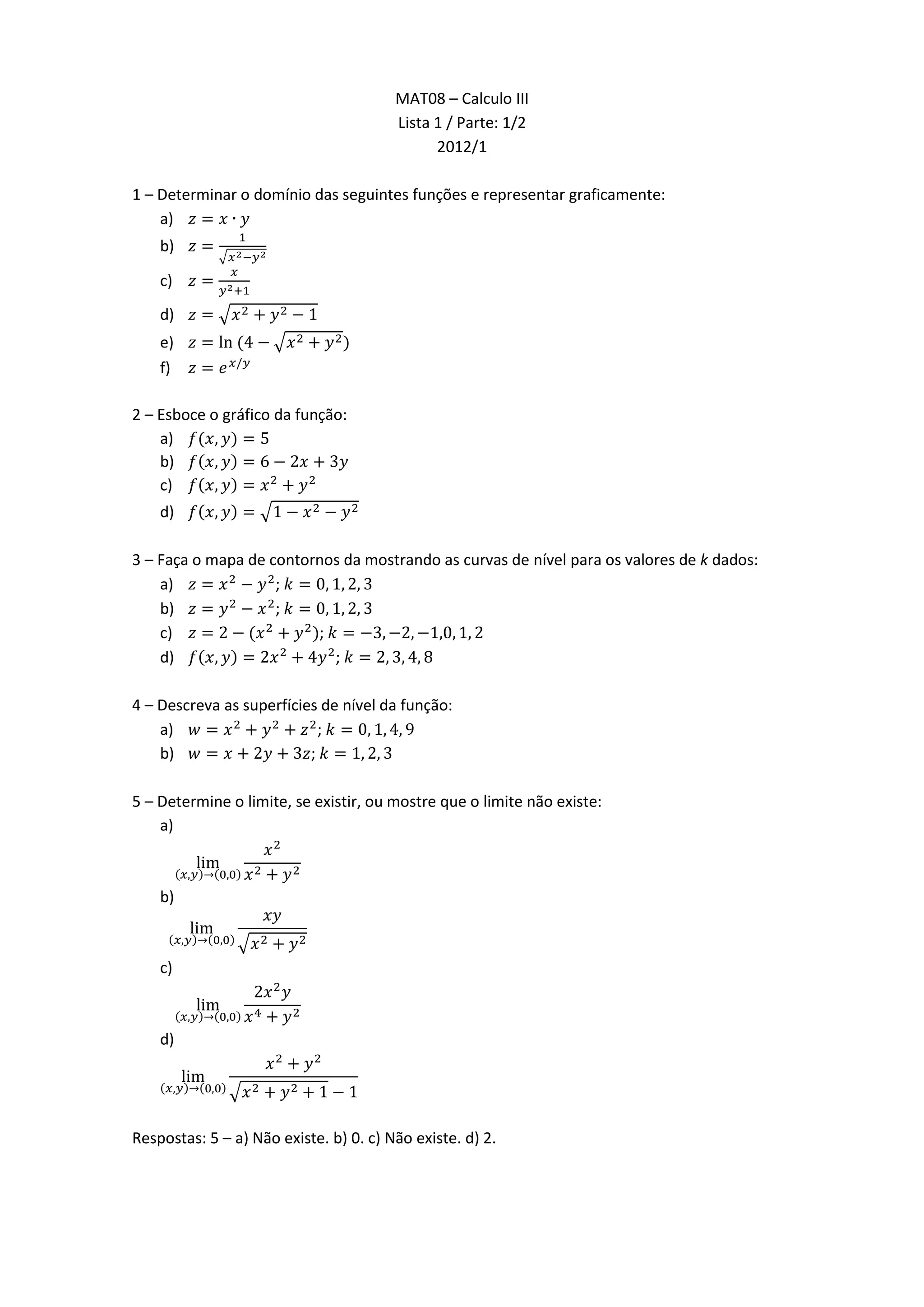 Este documento é uma lista de exercícios de cálculo III dividida em duas partes. A primeira parte contém exercícios sobre determinar domínios de funções, esboçar gráficos de funções e fazer mapas de contornos. A segunda parte pede para descrever superfícies de nível e determinar limites de funções.