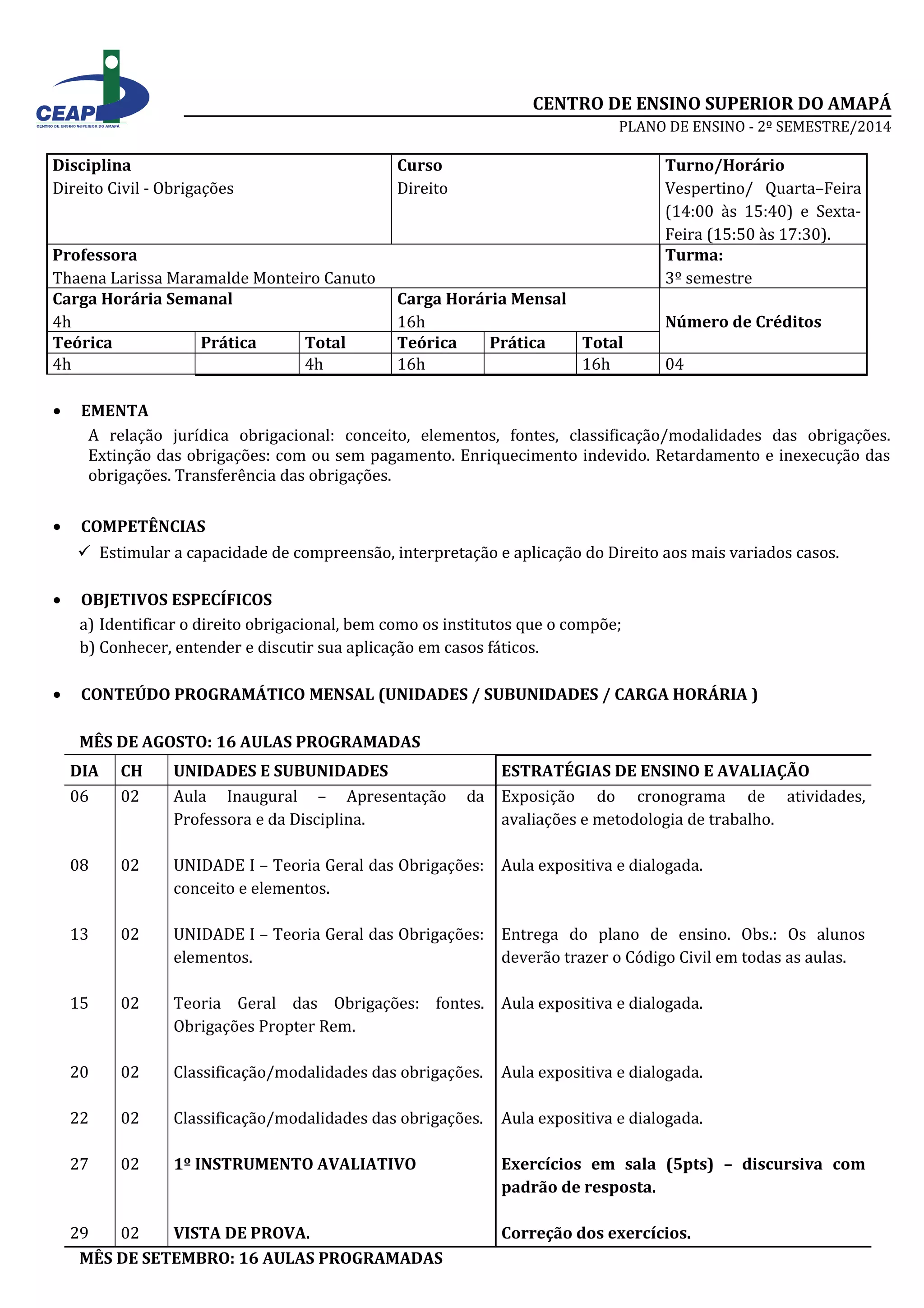 Este documento apresenta o plano de ensino da disciplina Direito Civil - Obrigações no Centro de Ensino Superior do Amapá para o segundo semestre de 2014. O plano detalha o cronograma de aulas, conteúdo programático, estratégias de ensino e avaliação para a disciplina ministrada pela professora Thaena Larissa no turno vespertino para alunos do 3o semestre de Direito.