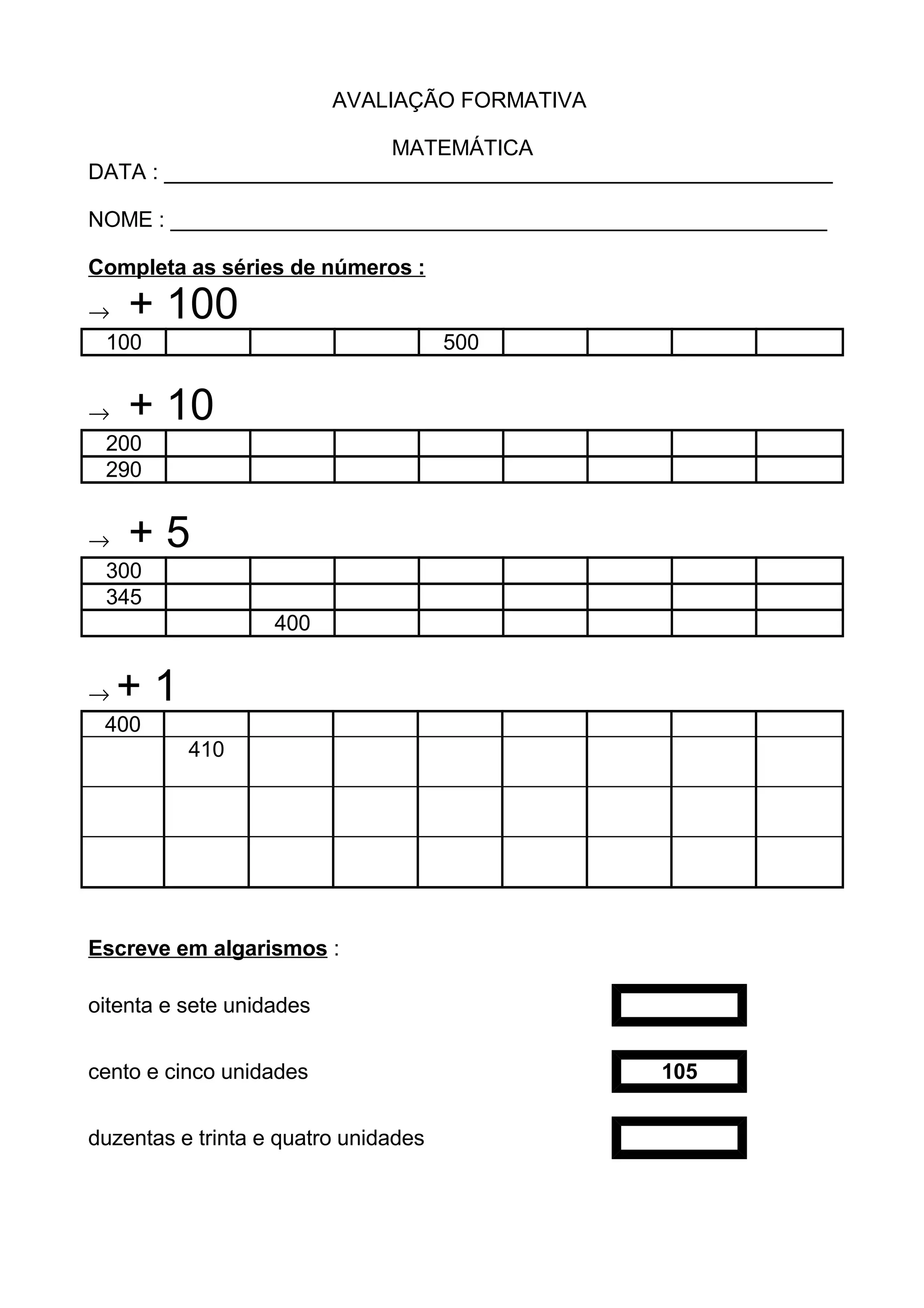 1) O documento contém exercícios de matemática sobre séries numéricas, escrita de números por extenso e algarismos, relacionar expressões numéricas com operações e algoritmos.
