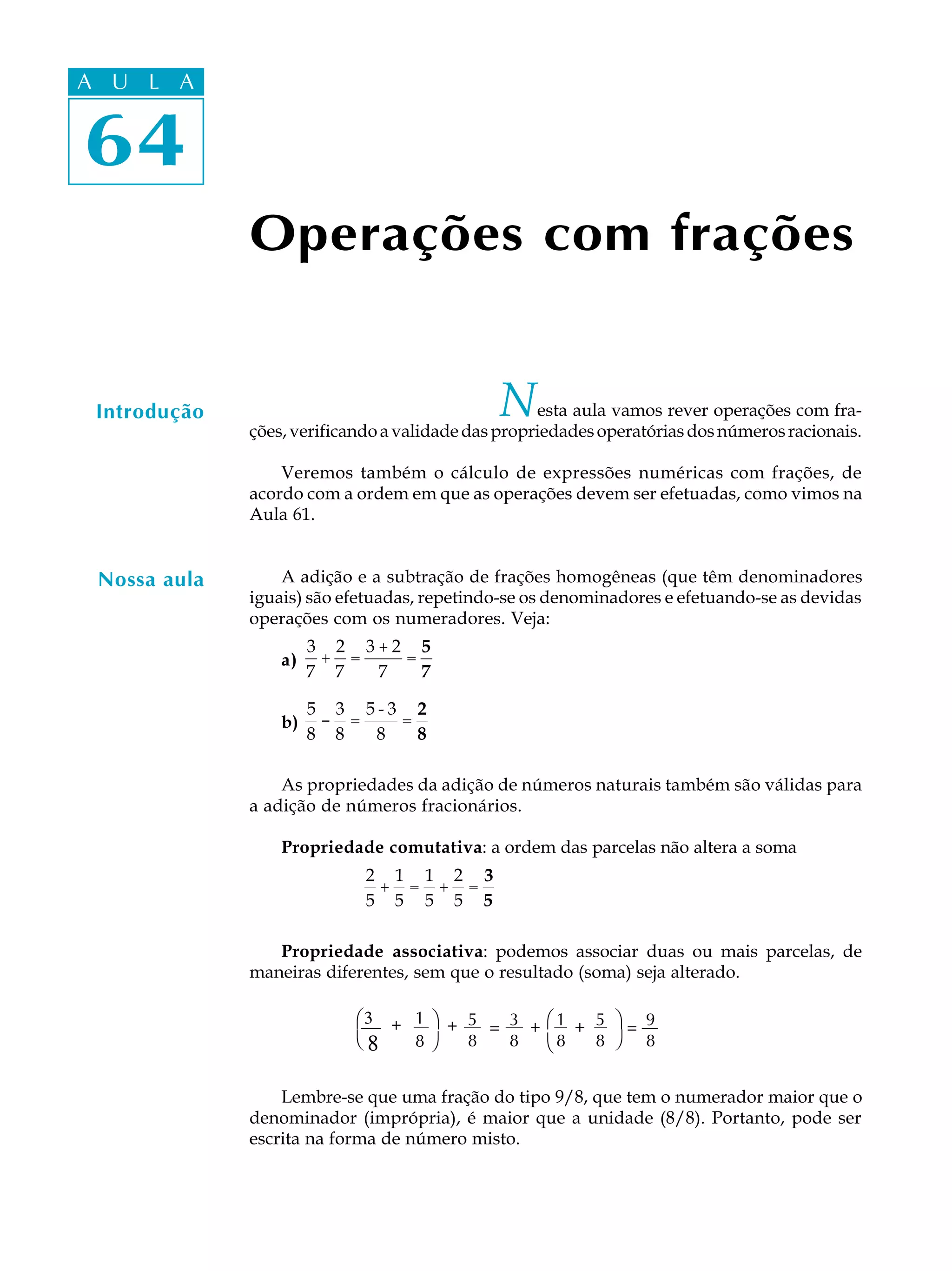 1) O documento discute operações com frações, incluindo adição, subtração, multiplicação e expressões numéricas.