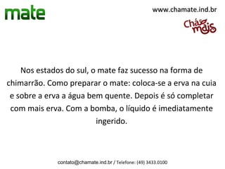 O documento fornece instruções sobre como preparar o chimarrão tradicional do sul do Brasil, explicando que a erva-mate é colocada na cuia e água quente é despejada sobre ela. A bomba é usada para ingerir o líquido. Além disso, ressalta os benefícios da erva-mate e instrui o leitor a acessar o site para saber mais.