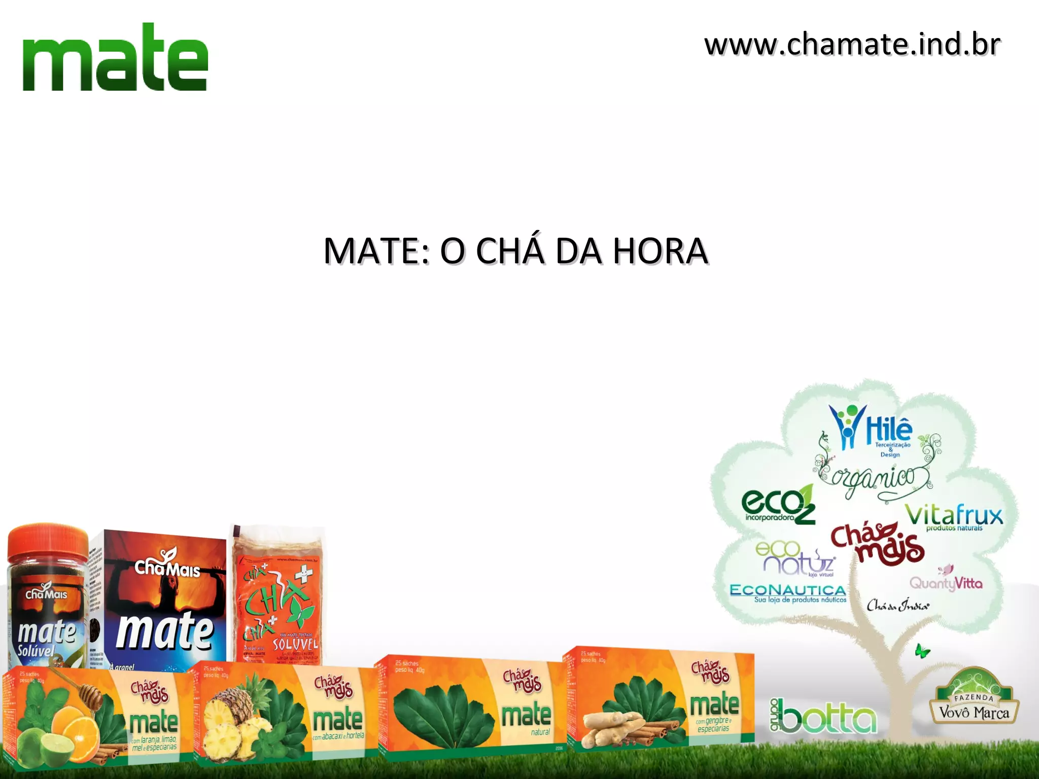 O documento descreve as propriedades nutricionais e benefícios à saúde do chá-mate. Ele contém vitaminas, minerais e compostos fenólicos que combatem radicais livres, prevenindo doenças. O chá-mate também estimula o cérebro e elimina a fadiga.