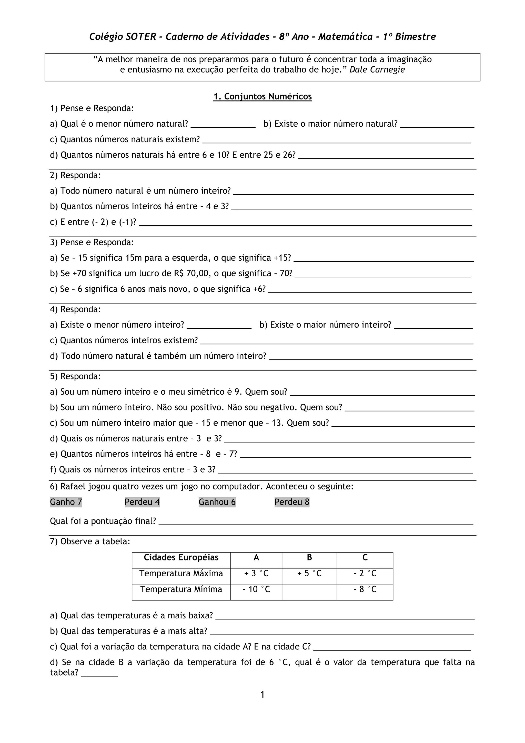 O documento apresenta uma série de exercícios sobre conjuntos numéricos, potenciação e cálculo algébrico. Os exercícios abordam tópicos como números naturais, inteiros, racionais e irracionais, representação científica, operações com expressões algébricas e polinômios.