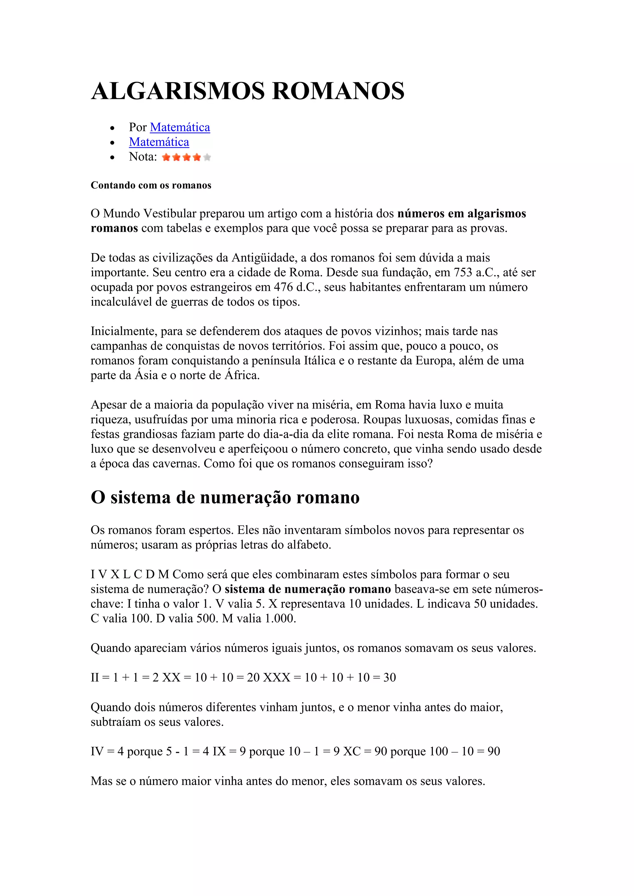 O documento fornece informações sobre o sistema de numeração romano, incluindo como os romanos combinavam símbolos para representar números e realizar cálculos. Também apresenta exemplos de conversão entre os sistemas numéricos romano e arábico.