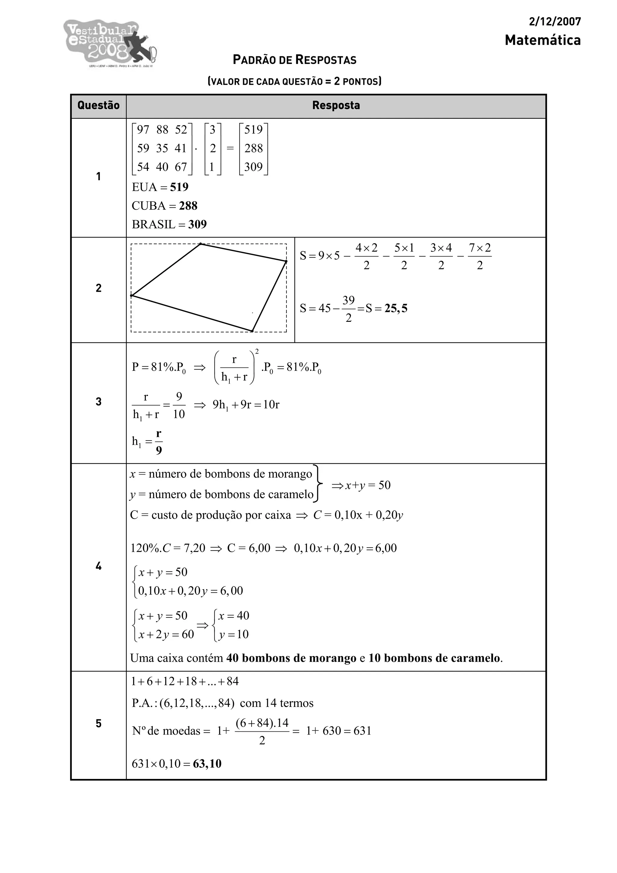 O documento contém um padrão de respostas para uma prova de matemática com 10 questões. A primeira questão apresenta uma série de resultados numéricos. As demais questões envolvem cálculos algébricos, geométricos e financeiros como porcentagem, área, equações de reta, volume e desigualdades.