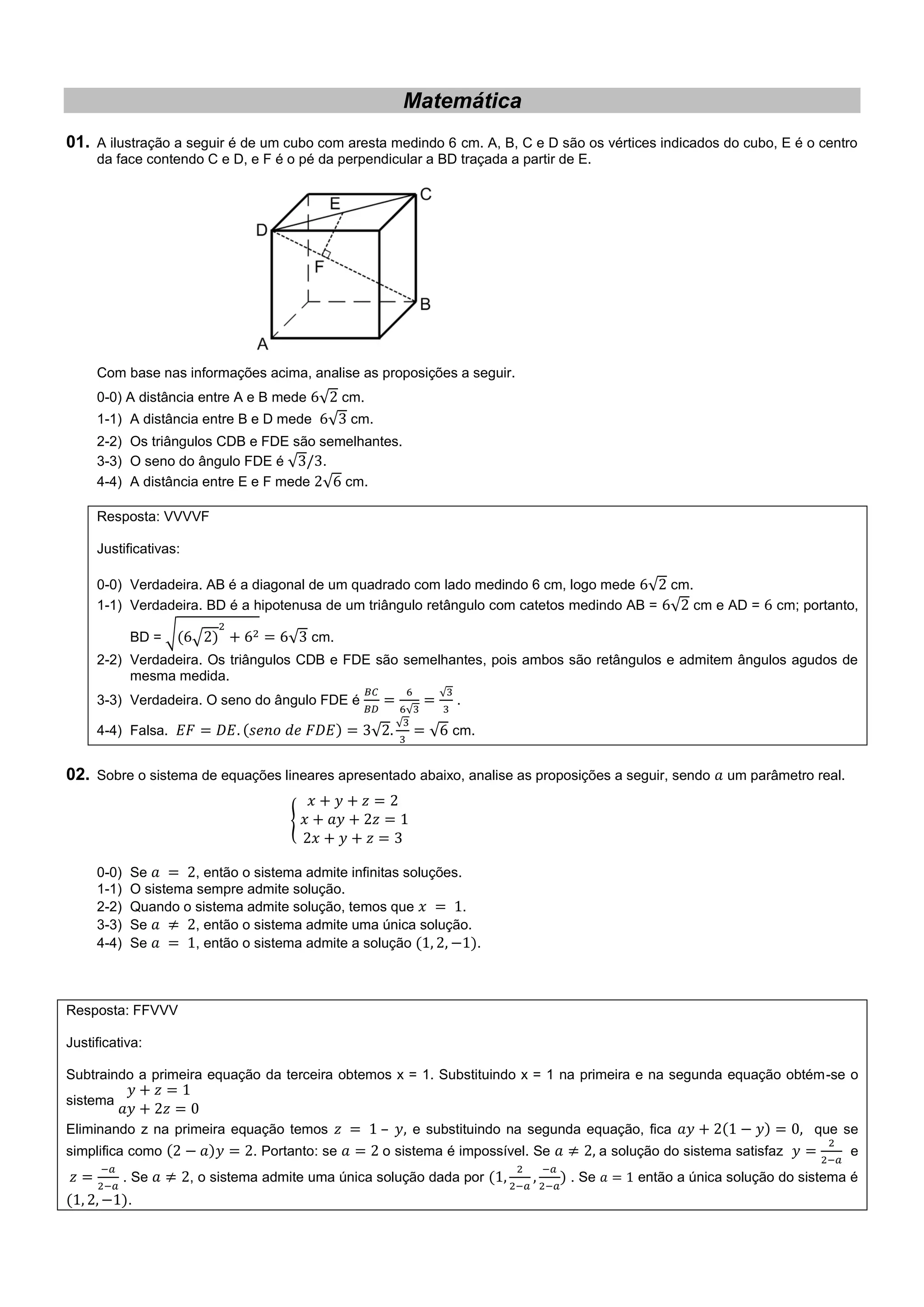 O documento apresenta 16 questões de matemática sobre geometria, sistemas de equações lineares, funções, probabilidades e outras temáticas. As questões analisam proposições e pedem para calcular valores numéricos relacionados aos enunciados.