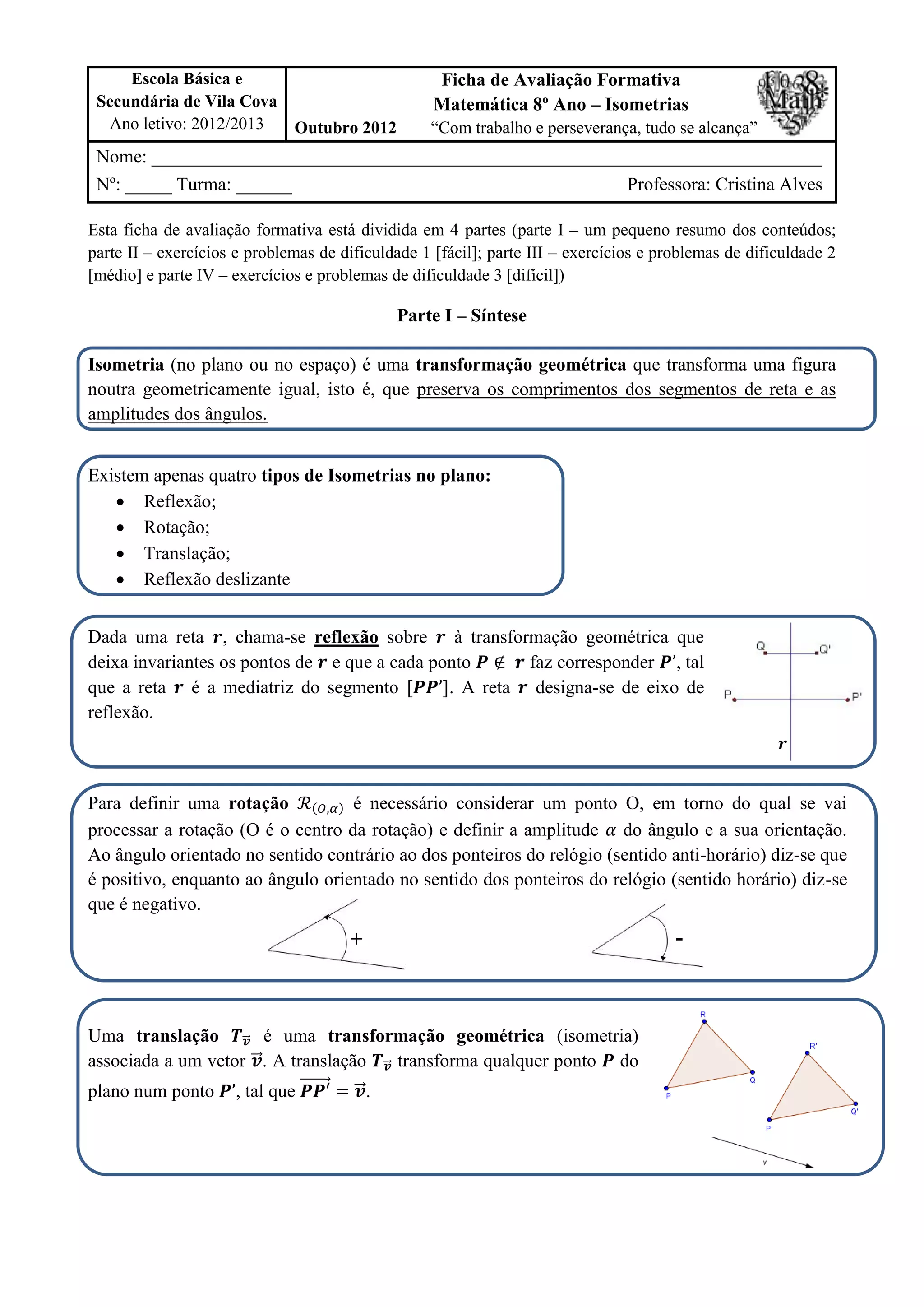 Este documento apresenta uma ficha de avaliação formativa sobre isometrias em matemática do 8o ano. A ficha inclui quatro partes com exercícios de dificuldade crescente sobre reflexões, rotações, translações e vetores no plano.