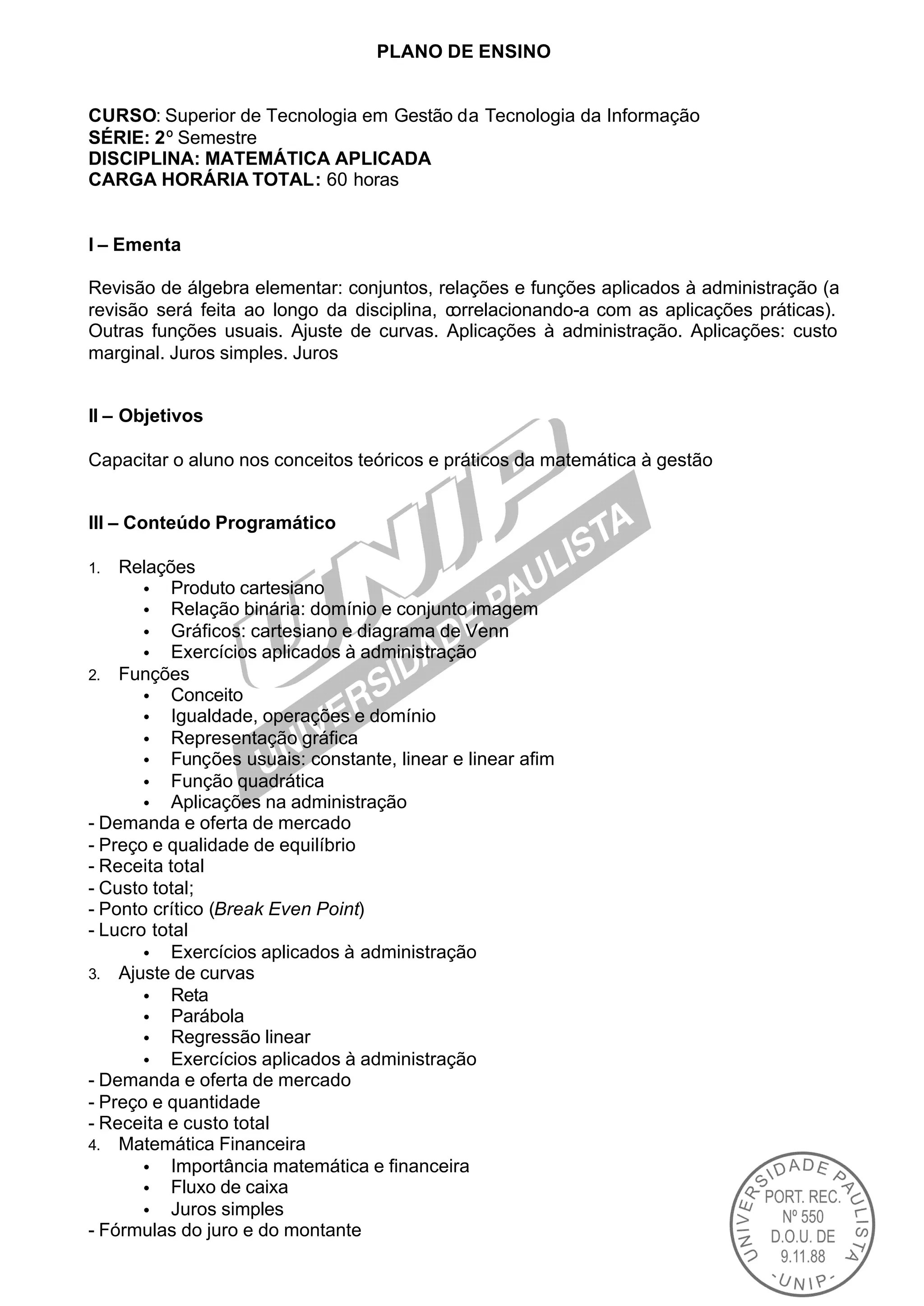 Este plano de ensino descreve uma disciplina de matemática aplicada para estudantes de gestão da tecnologia da informação. O curso irá cobrir relações, funções, ajuste de curvas e matemática financeira, com foco em aplicações práticas para administração. Os alunos serão avaliados por meio de provas, trabalhos e seminários.