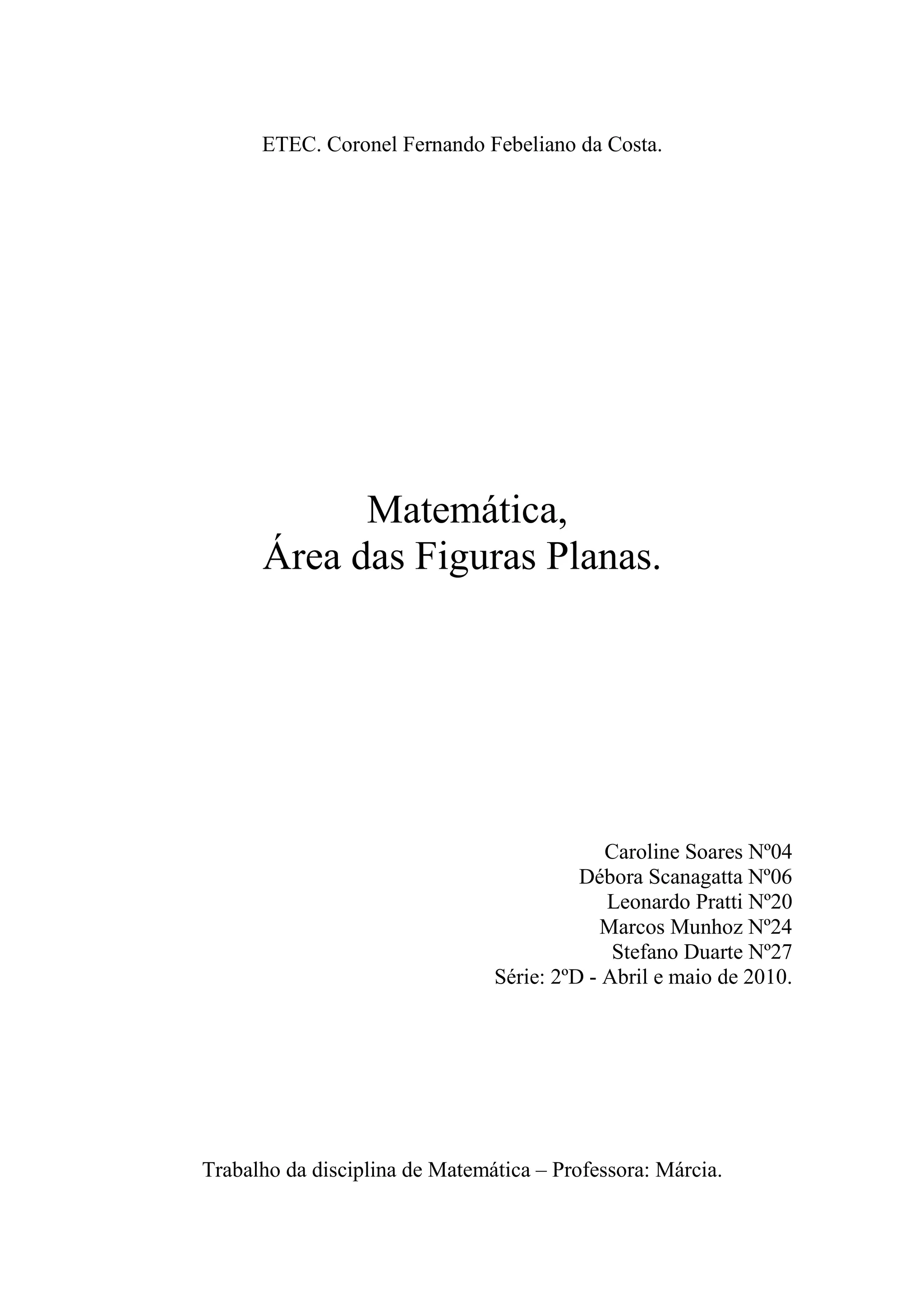 O documento apresenta um trabalho sobre áreas de figuras planas realizado por alunos de uma escola técnica. Ele inclui introdução à geometria, história do desenvolvimento da geometria, cálculo de áreas de diferentes figuras geométricas como retângulos, triângulos e círculos, além de exercícios sobre o tema.