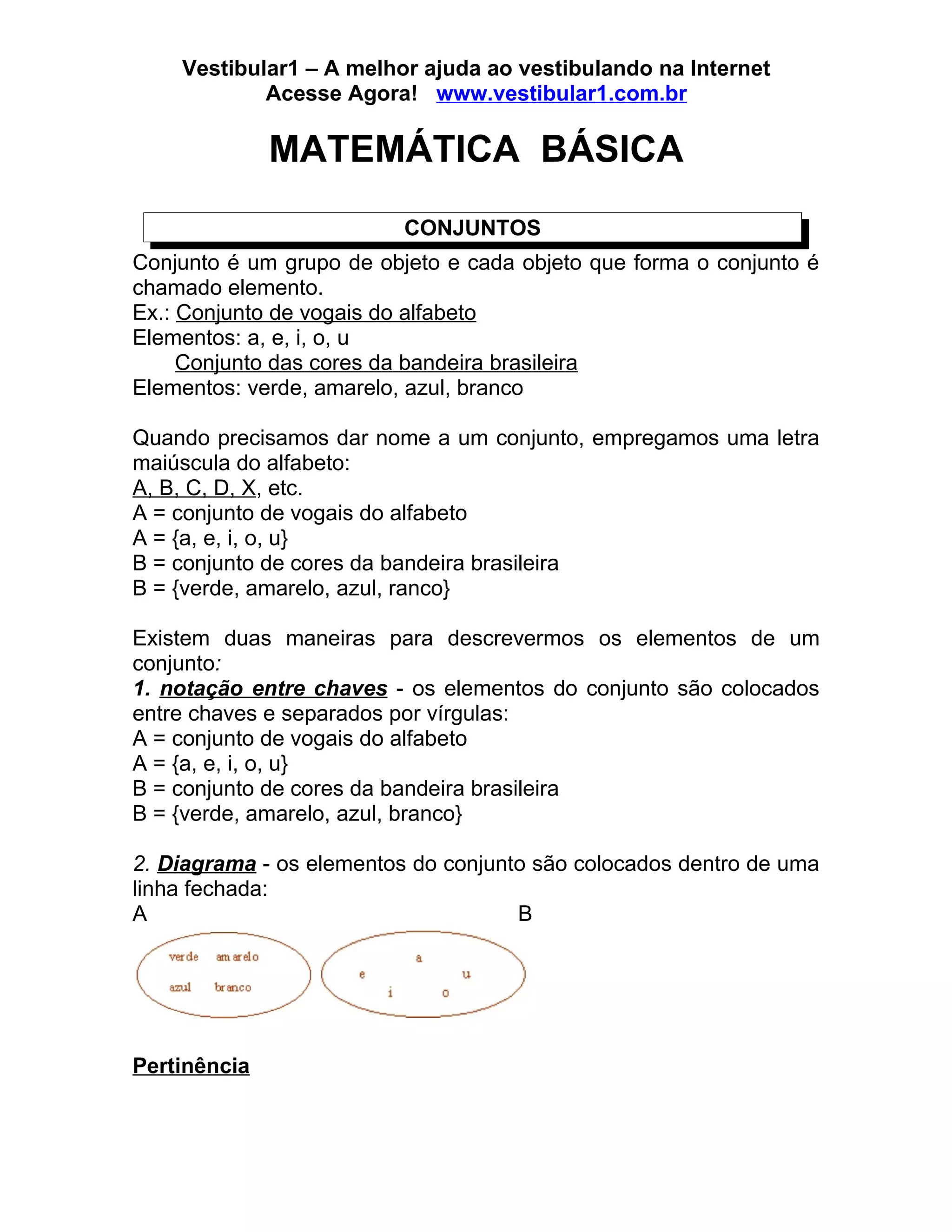 1. O documento apresenta os conceitos básicos de conjuntos e operações matemáticas como adição, subtração, multiplicação e divisão.