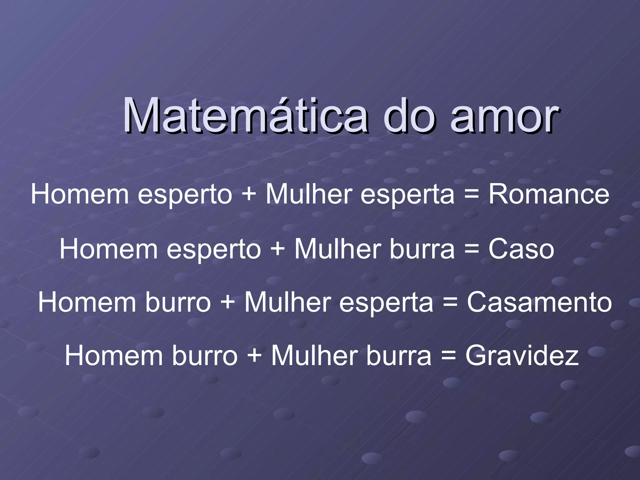Este documento contém vários textos curtos sobre relacionamentos e casamentos que exploram estereótipos de gênero de forma humorística. Alguns dos tópicos abordados incluem matemática do amor, aritmética de escritório, sucesso versus fracasso, sexo versus casamento e felicidade no relacionamento.