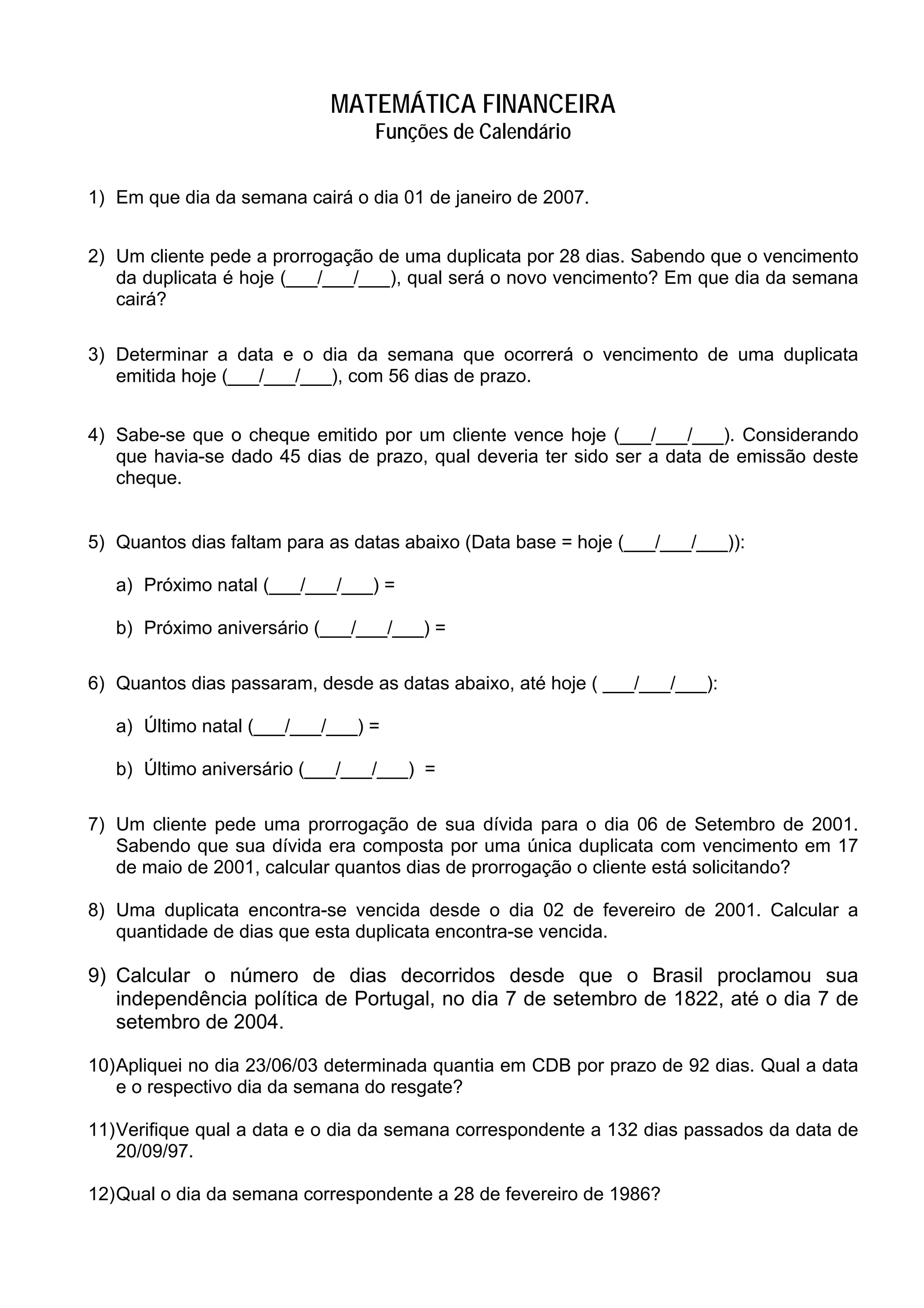O documento apresenta 12 exercícios sobre funções de calendário para cálculo de datas, dias da semana e quantidades de dias entre datas. Os exercícios envolvem determinar datas de vencimento, emissão, resgate e vencimento de títulos baseados em datas iniciais e prazos em dias.